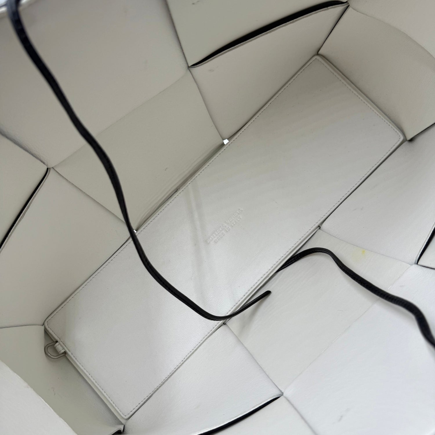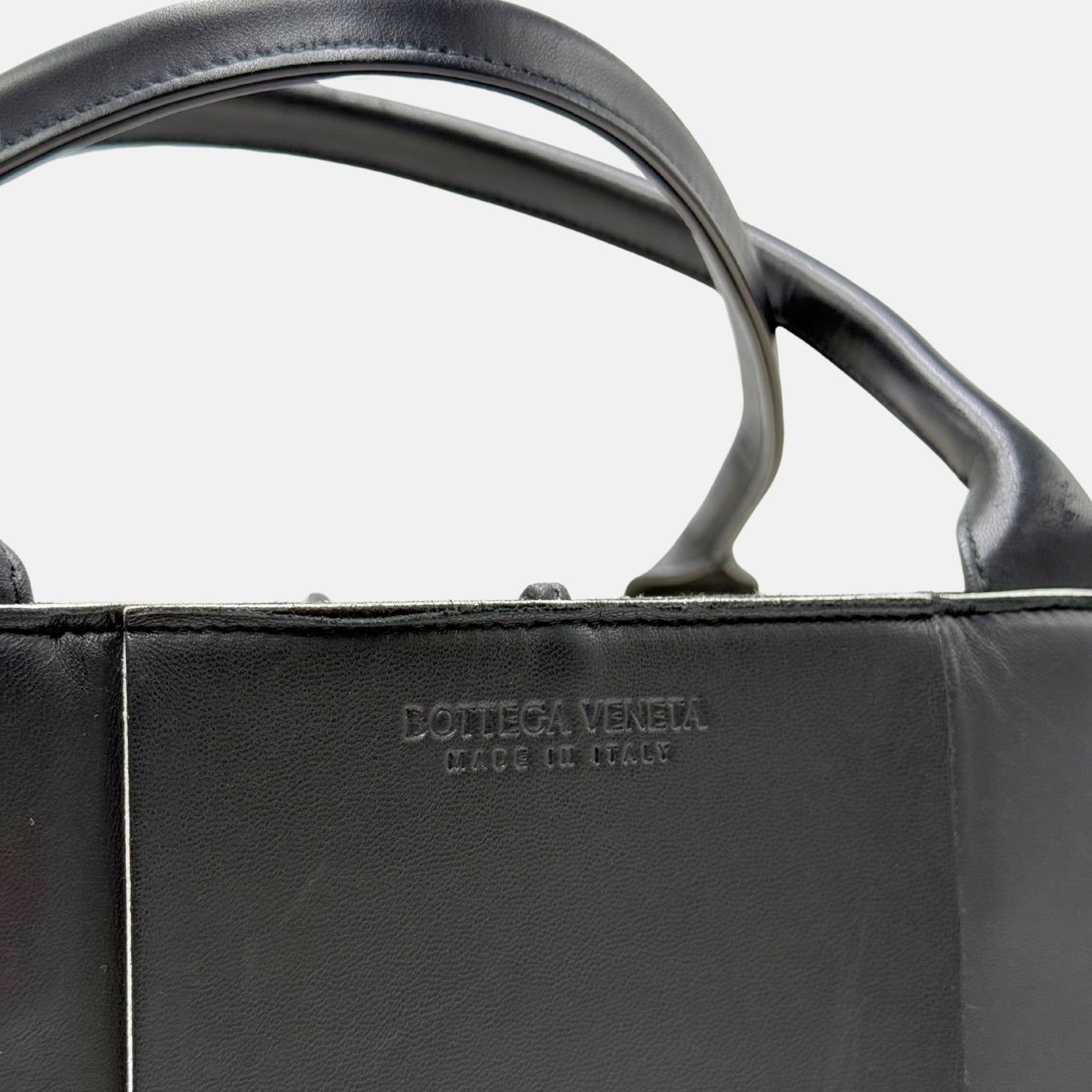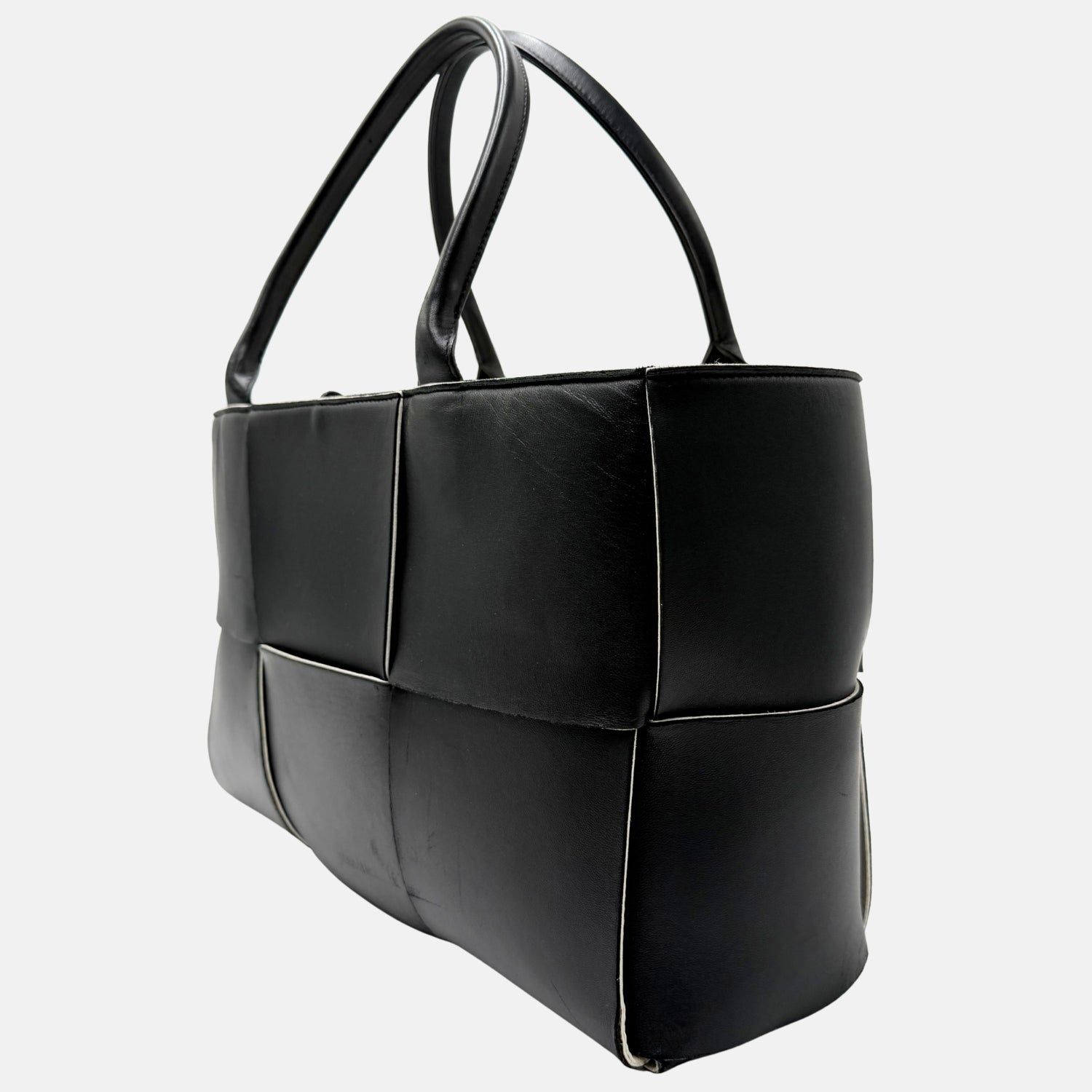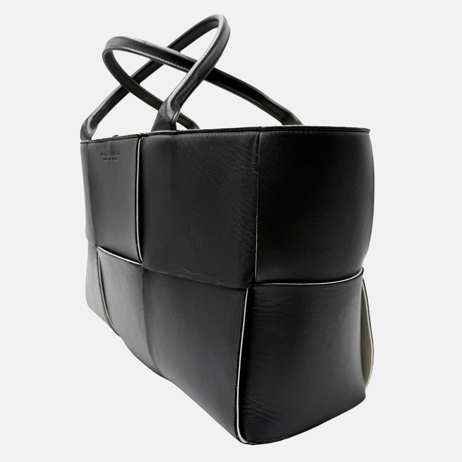 A modern expression of Bottega Veneta’s craftsmanship, the Arco Tote Bag in black Intreccio leather is defined by its oversized woven panels and structured silhouette. Made in Italy from smooth calfskin, this sleek tote features double rolled top handles and an open interior spacious enough for everyday essentials. Understated yet iconic, the debossed logo at the top adds a subtle touch of branding.