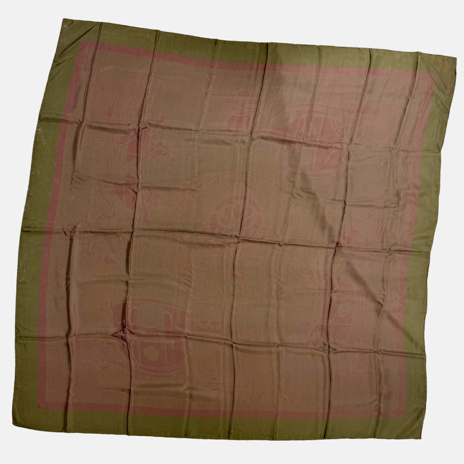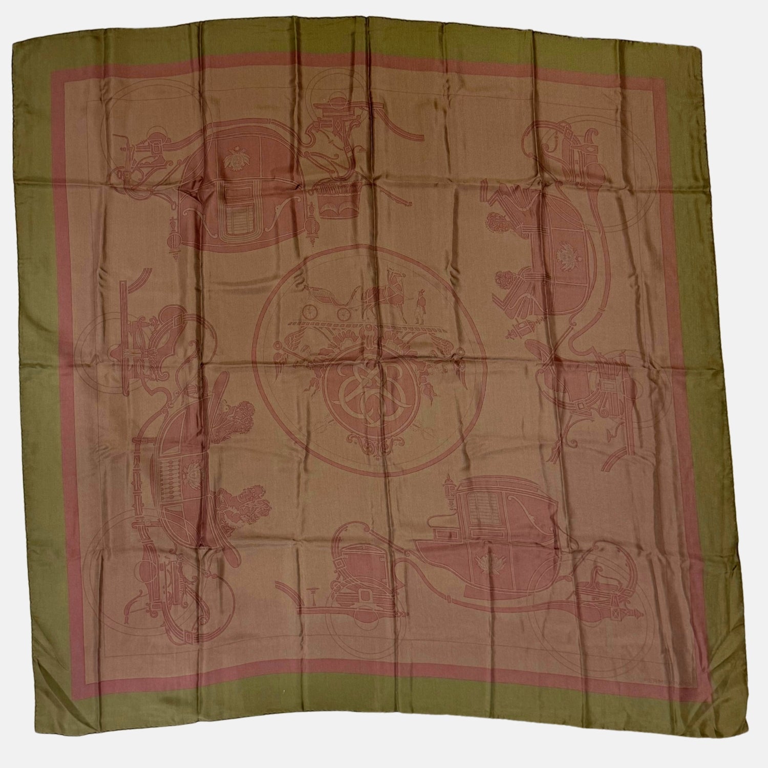 The Hermès Attelages Carriage Scarf 140 pays homage to the elegance of equestrian transport with intricately illustrated horse-drawn carriages arranged in a circular motif. Crafted from 100% silk in the house’s special surtout dip dye technique, the scarf has a soft, vintage-inspired finish that enhances its warm palette. Olive green borders frame a rose-brown center, adding depth and sophistication to this collectible square. A beautiful expression of Hermès’ harness-making heritage.