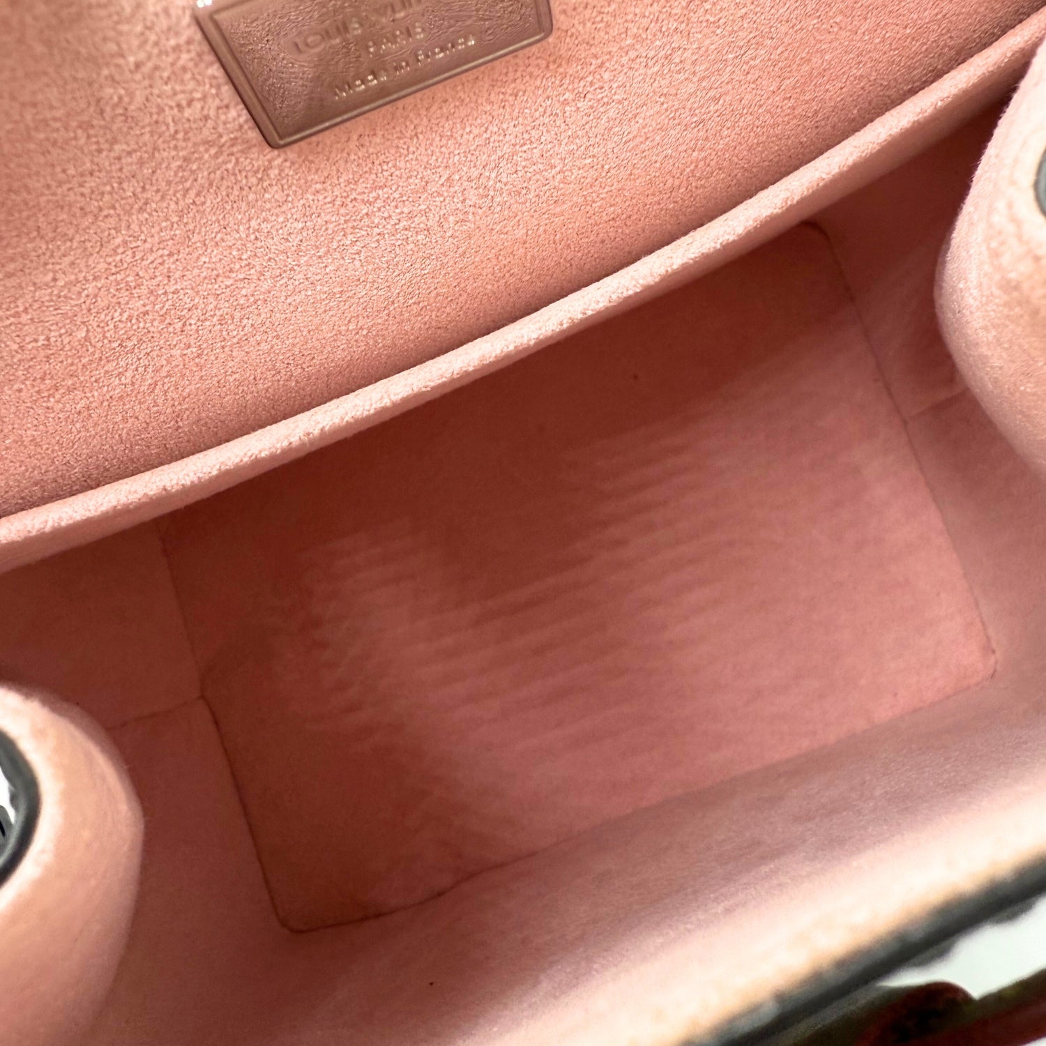 A sweet-meets-sleek take on Louis Vuitton’s signature style, the Rose Ballerine and Burgundy Vernis Monogram Montaigne Mini Backpack pairs glossy patent leather with a soft pink flap and rich burgundy base. The design features a natural Vachetta leather top handle, drawstring closure, and silver-tone LV push-lock clasp. Compact yet statement-making, this piece captures playful sophistication in every detail.