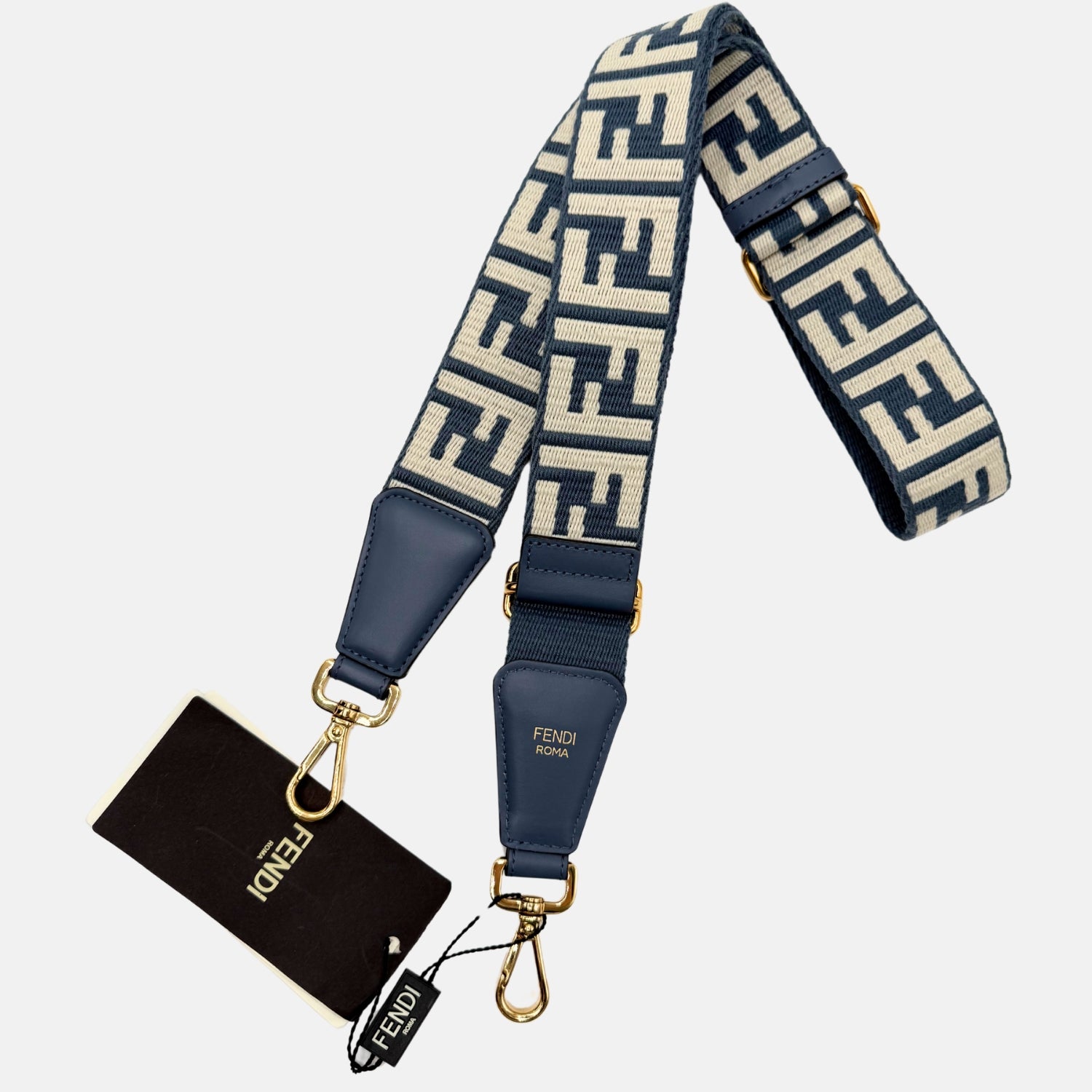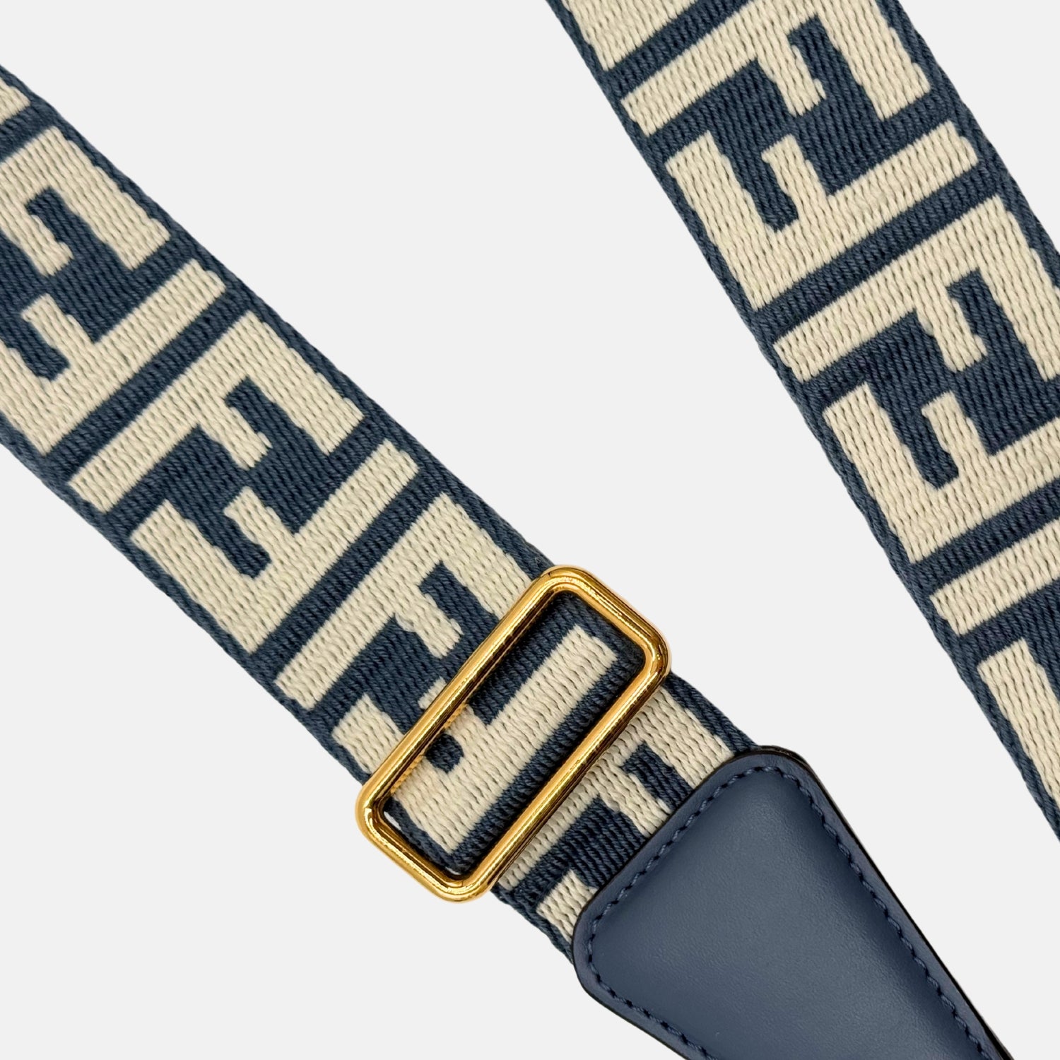 This is the Fendi FF Denim Jacquard Strap in Blue and Beige, a bold and elevated accessory that brings a statement touch to any bag. Featuring the iconic FF motif woven into a structured denim jacquard, the strap is trimmed with smooth blue leather at both ends. Finished with polished gold-tone hardware and an adjustable length, it’s the perfect mix of Fendi’s signature branding and laid-back luxury.
