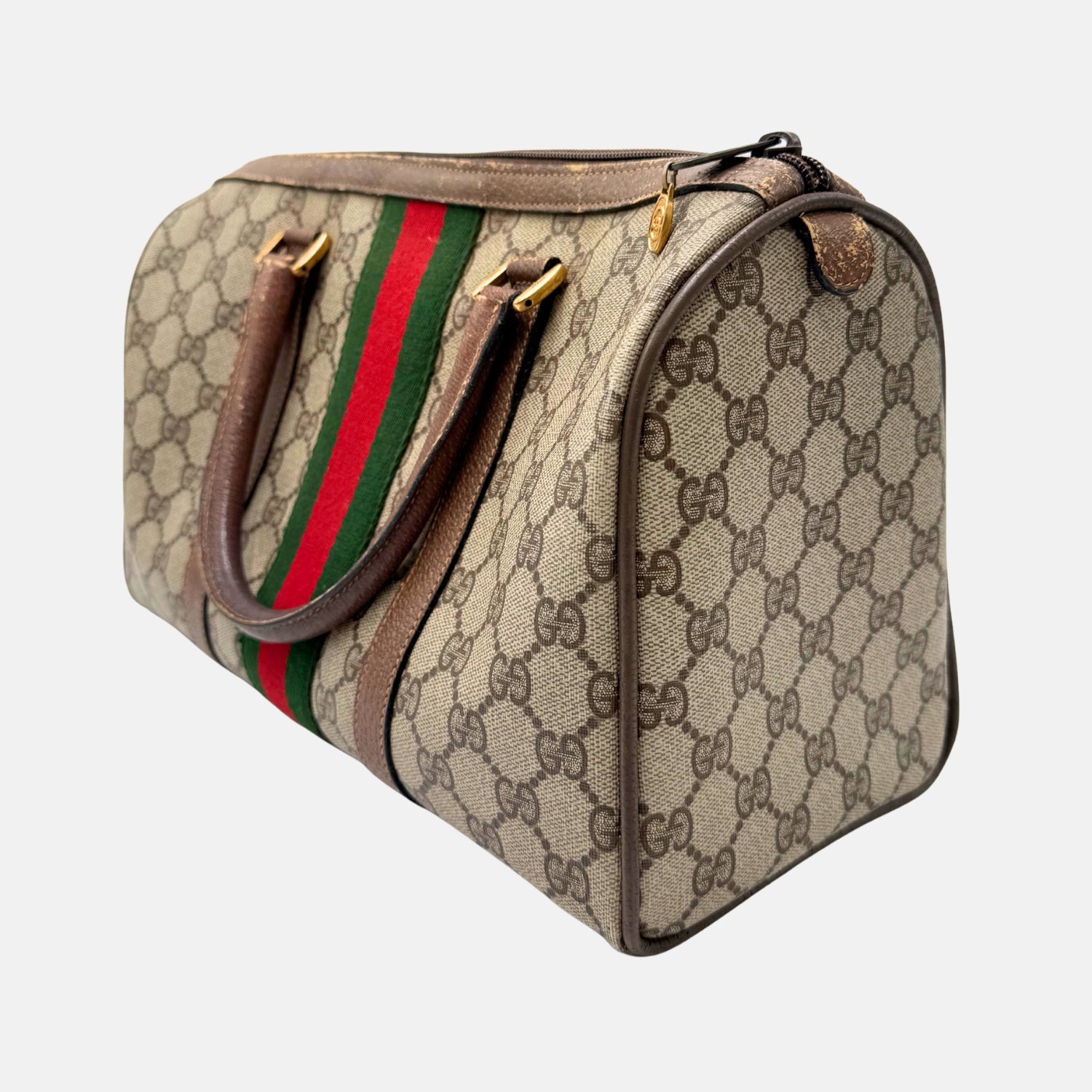 A vintage icon from Gucci’s heritage archives, the Boston Bag Medium is crafted from beige GG Supreme coated canvas with brown leather trim and the signature green and red Web stripe. This structured silhouette features rolled leather top handles, gold-tone hardware, and the interlocking GG crest at the front. With its sporty yet refined aesthetic, this bag remains a staple of the house’s travel-inspired legacy.