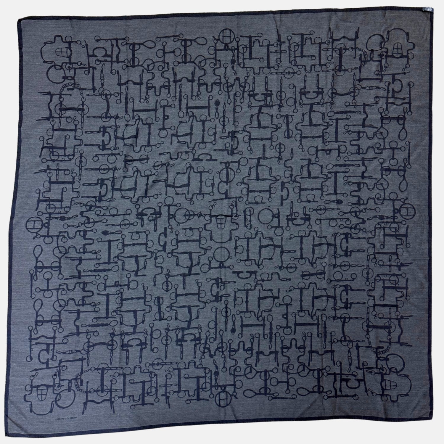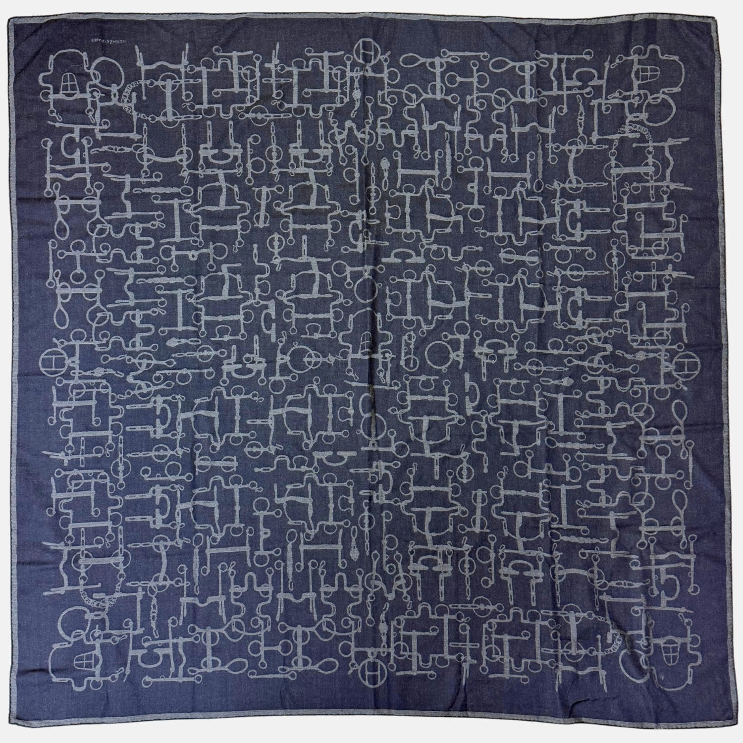 Chevaux et Carreaux Fringe Scarf 140 Blue Cashmere Silk