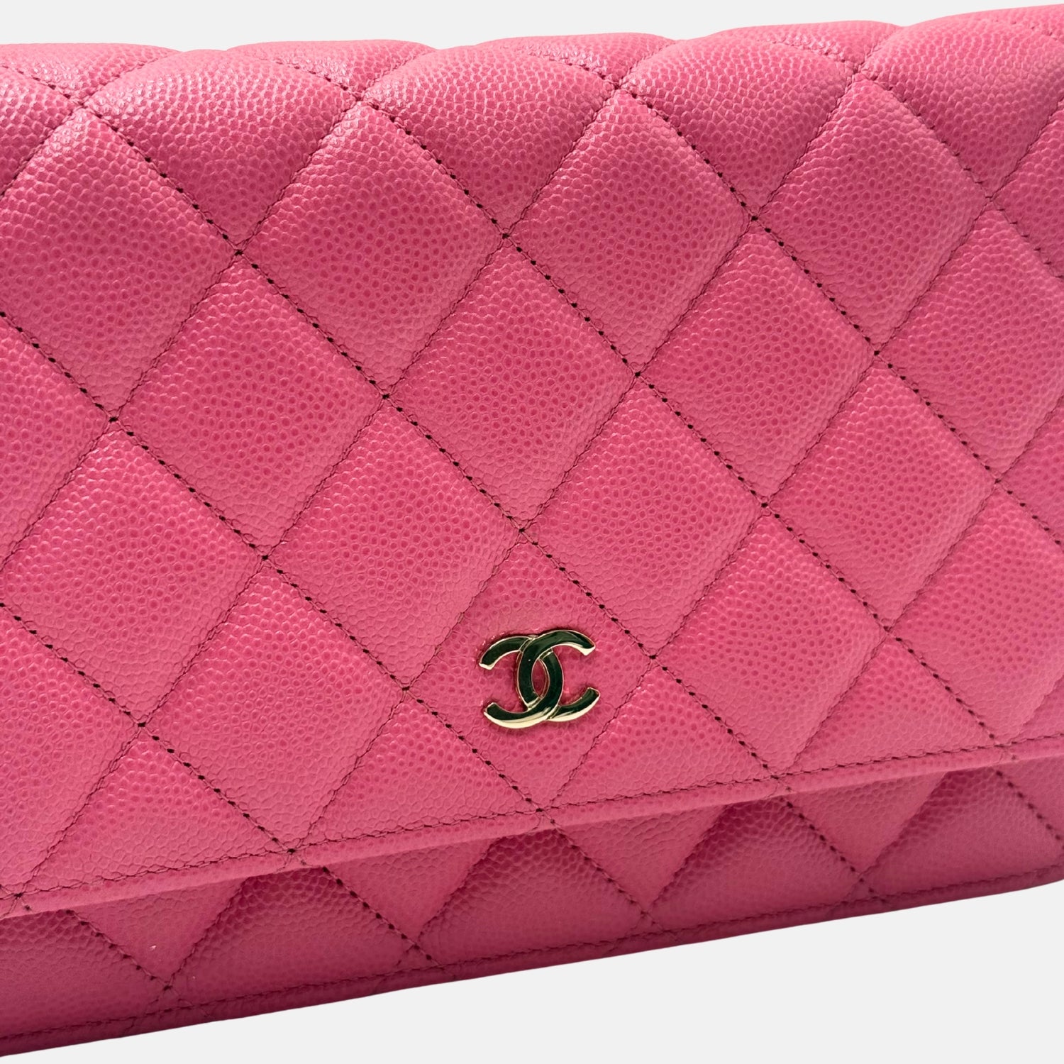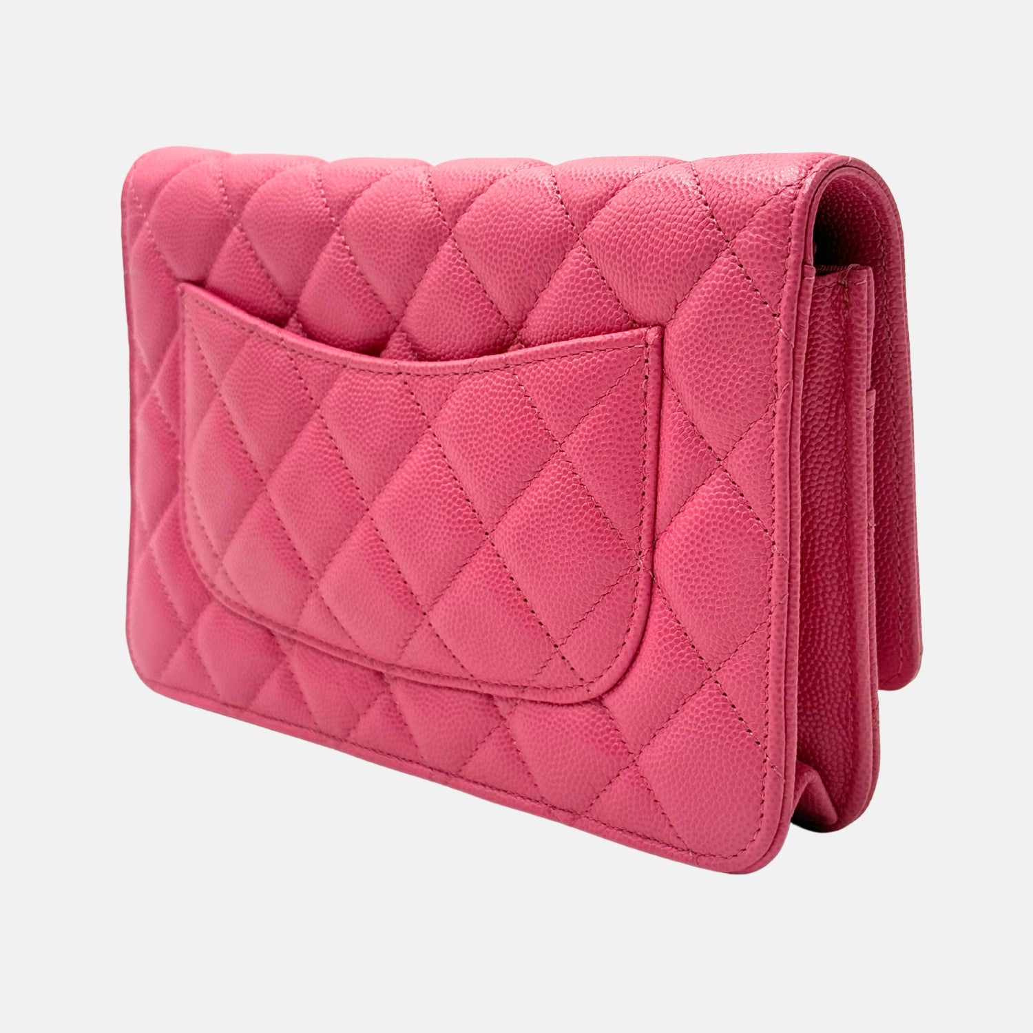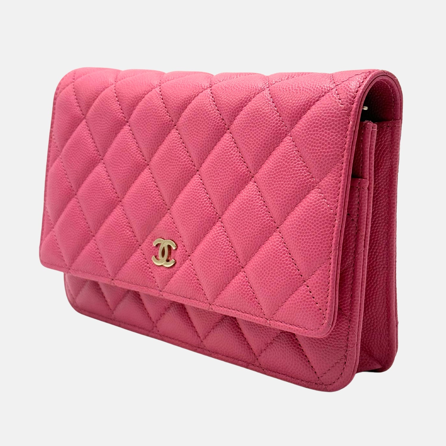 A signature piece from Chanel’s Classic line, this Wallet on Chain is crafted from durable pink caviar leather and features the iconic diamond quilting and front flap with the CC logo. Designed to be both versatile and elegant, it transitions seamlessly from day to night while holding your essentials in style.