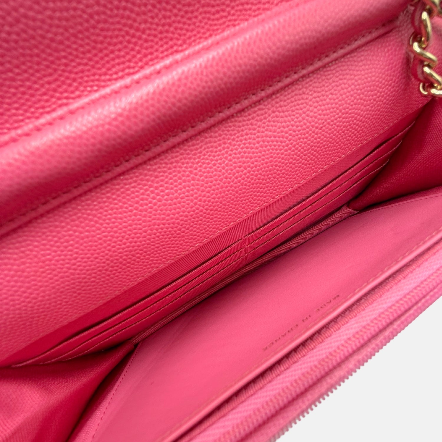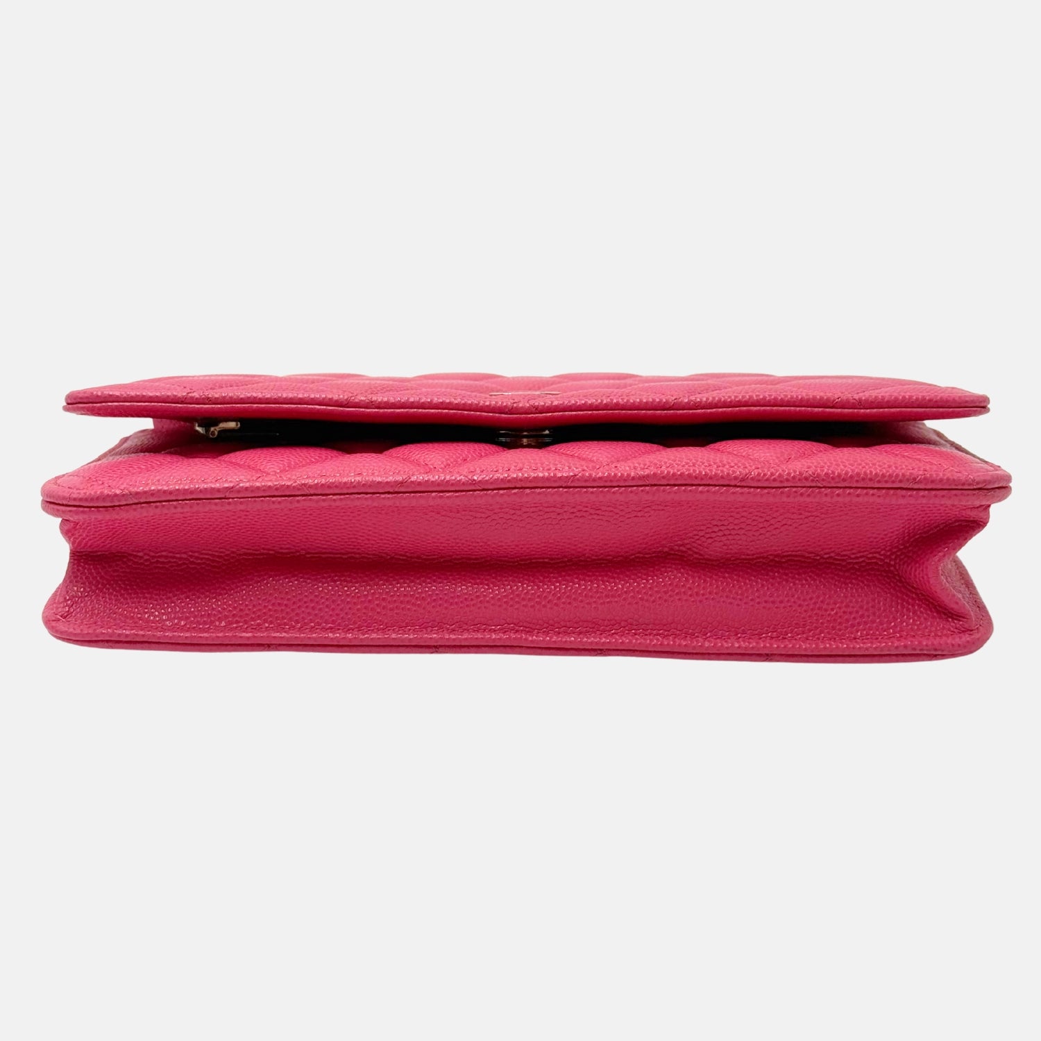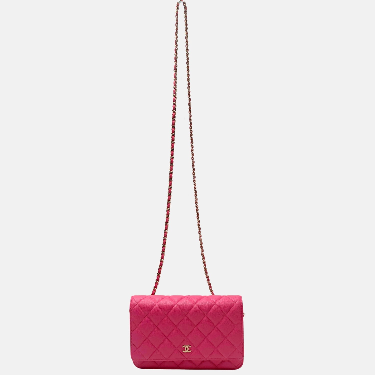 A signature piece from Chanel’s Classic line, this Wallet on Chain is crafted from durable pink caviar leather and features the iconic diamond quilting and front flap with the CC logo. Designed to be both versatile and elegant, it transitions seamlessly from day to night while holding your essentials in style.