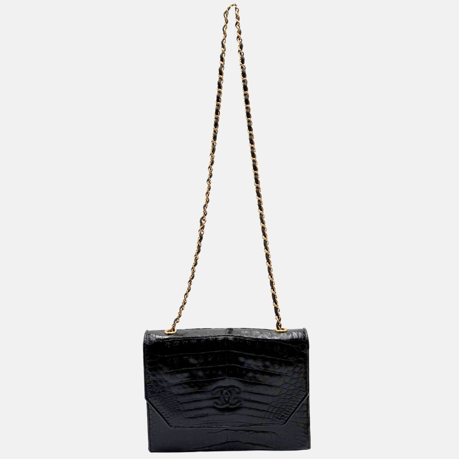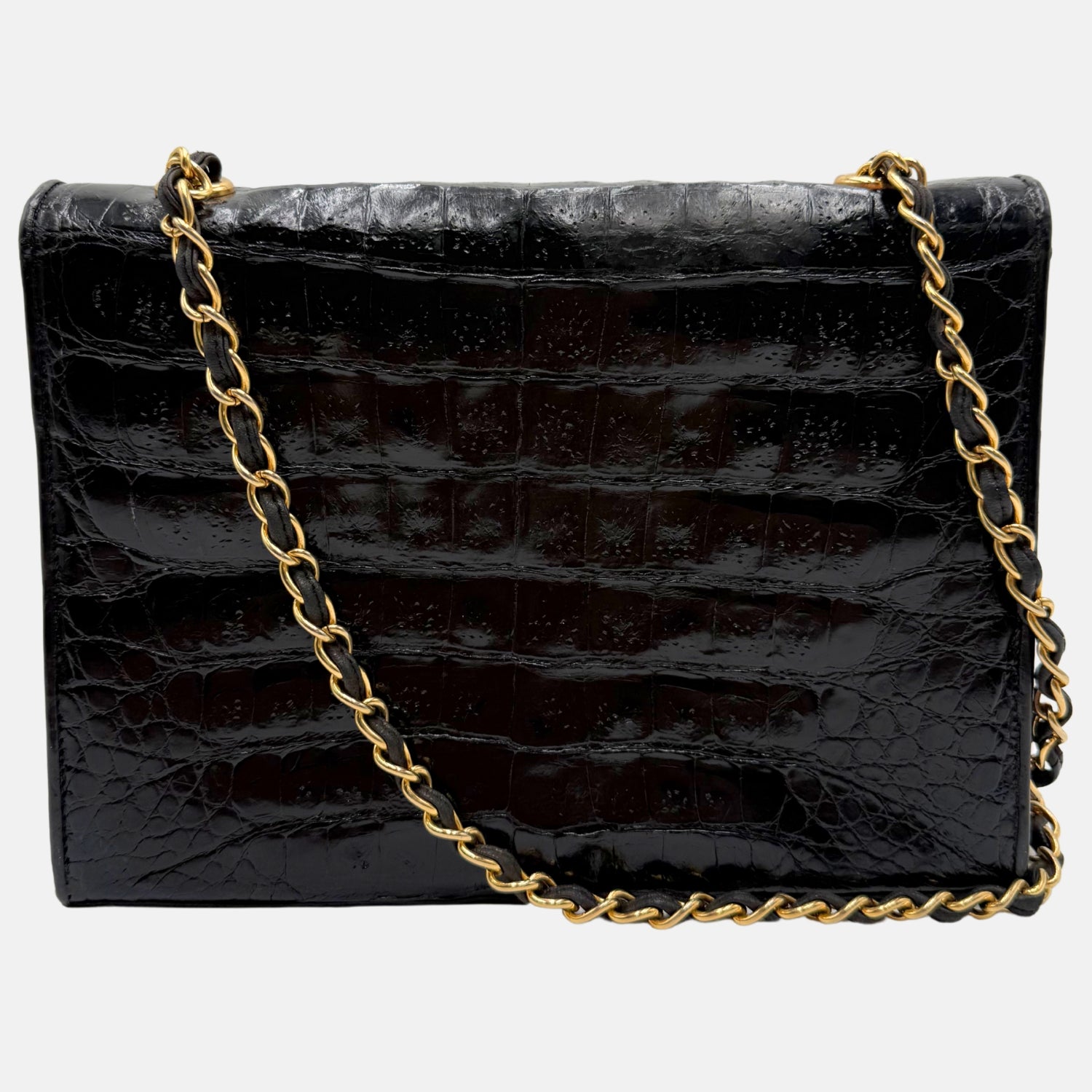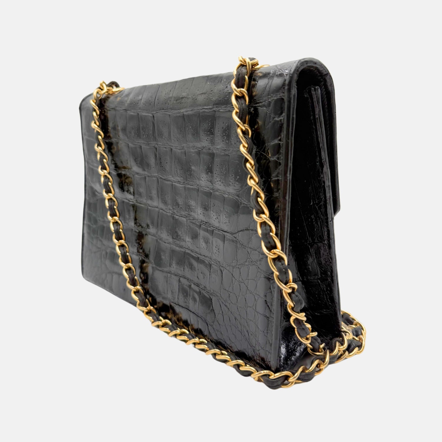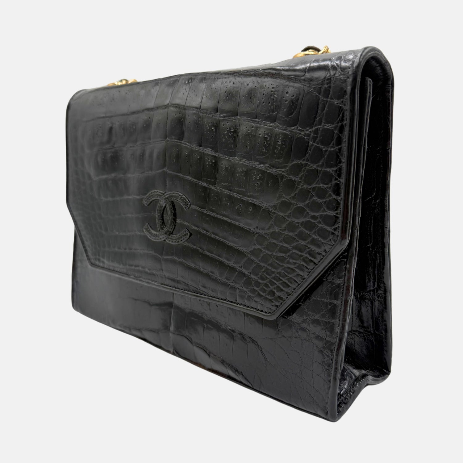 The Chanel Flap Bag Black Crocodile Leather Medium is an exceptionally rare and luxurious piece that embodies timeless elegance and exclusivity. Crafted from glossy black crocodile leather with a sleek envelope-style flap, it features a tonal stitched CC logo and classic gold-tone chain strap. With its structured silhouette and rich texture, this collector’s item offers a refined yet bold take on Chanel's iconic flap design.