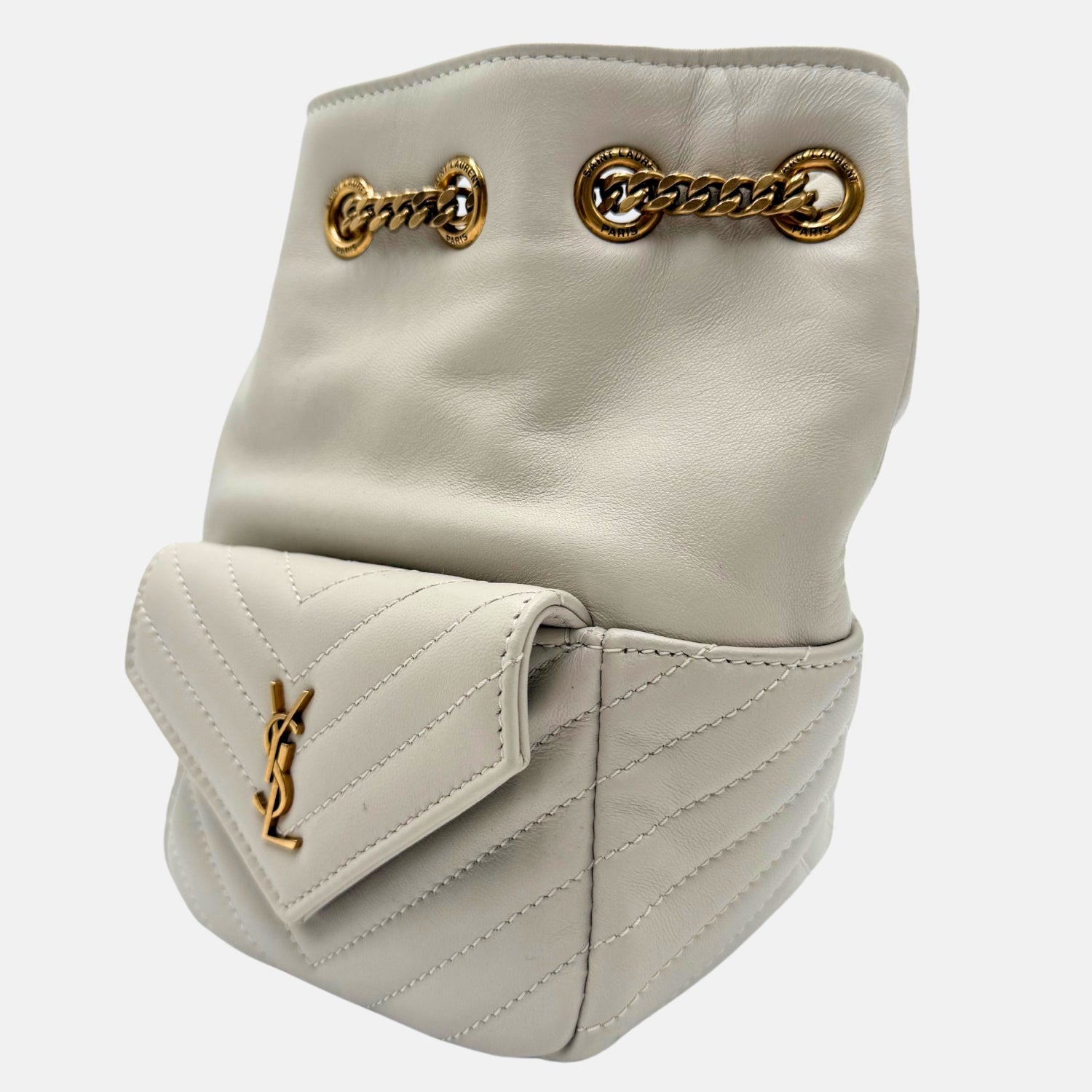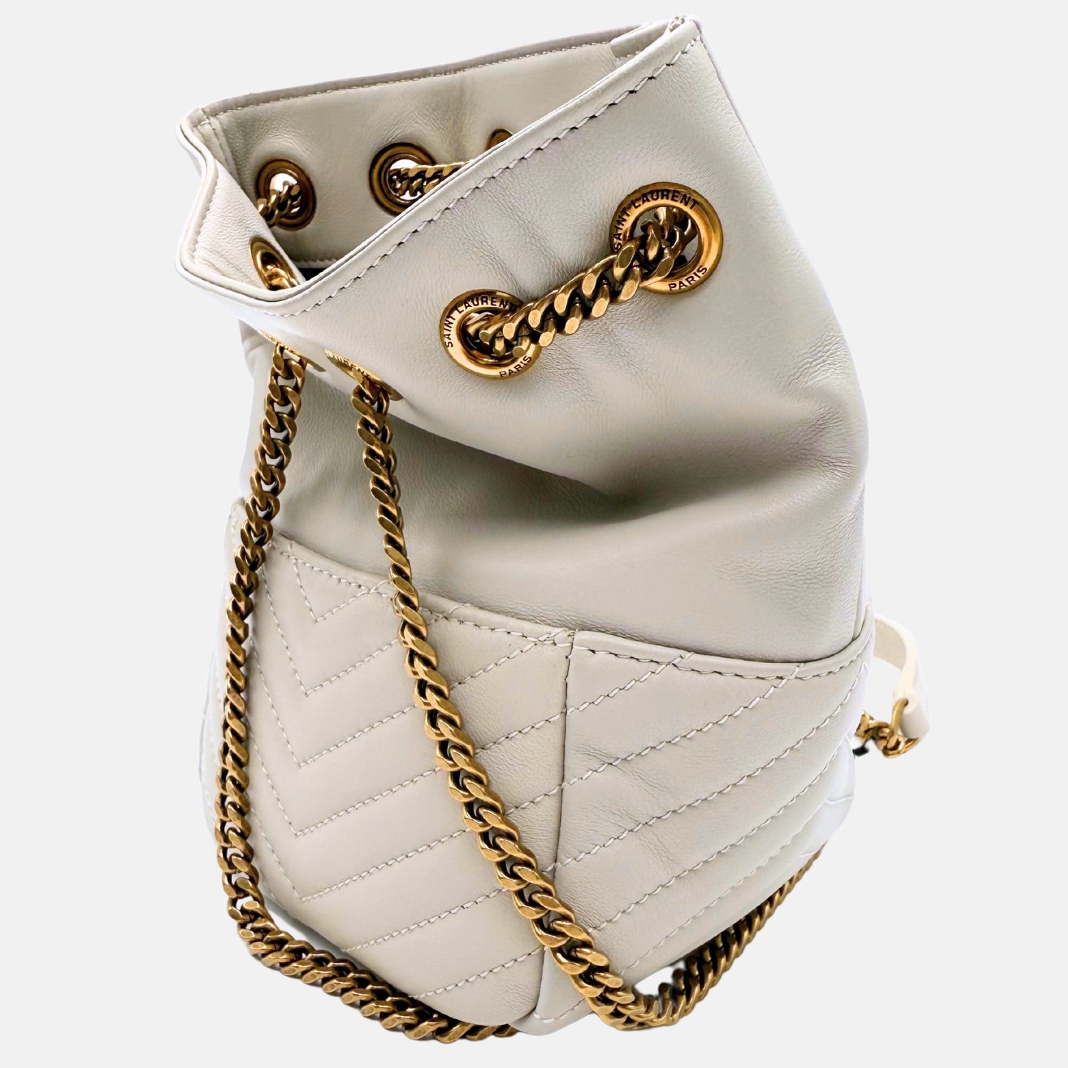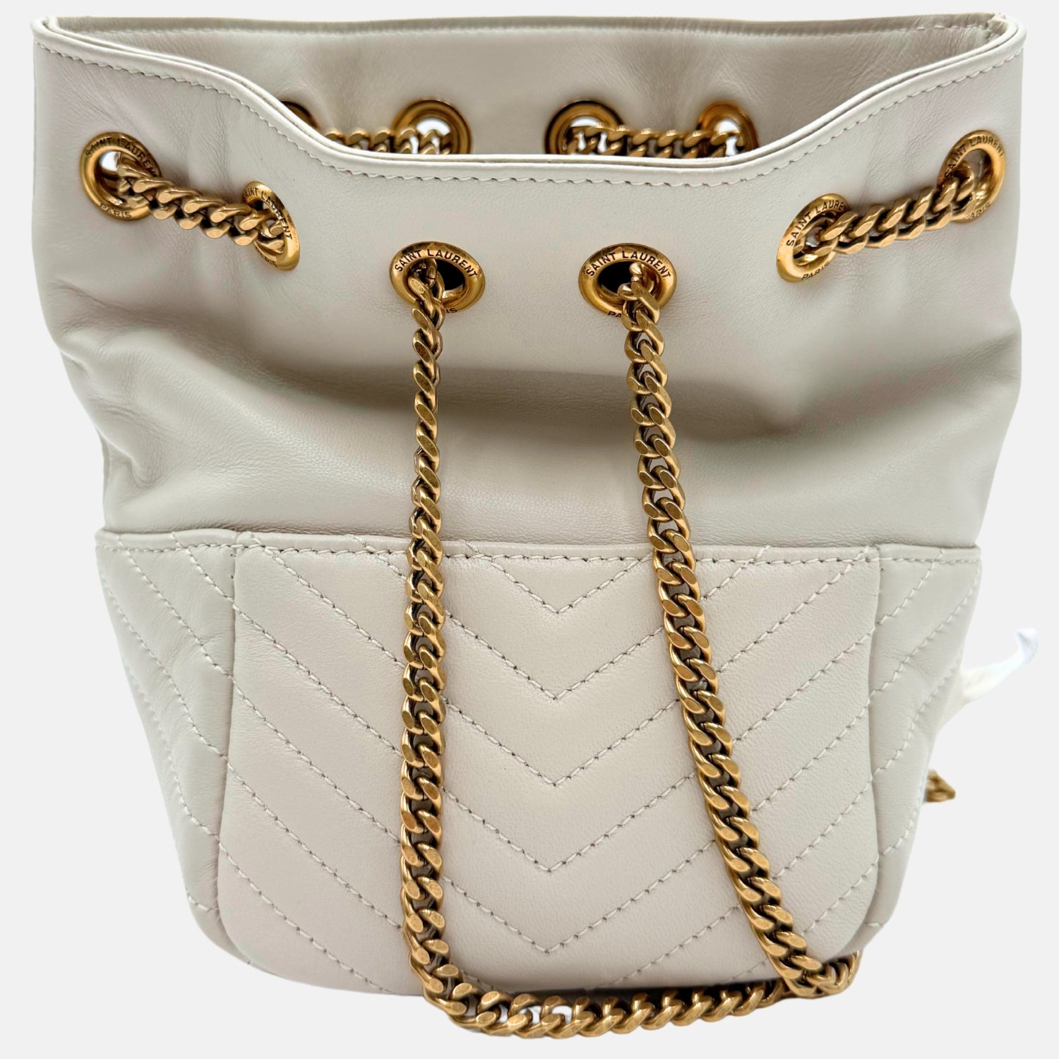 A fresh take on relaxed luxury, the Saint Laurent Jamie Bucket Bag in white quilted lambskin features a soft, supple body with signature chevron stitching and a structured front envelope pocket. Finished with the iconic YSL monogram in gold-tone hardware and matching grommet-and-chain drawstring detailing, this piece balances everyday function with unmistakable brand flair.