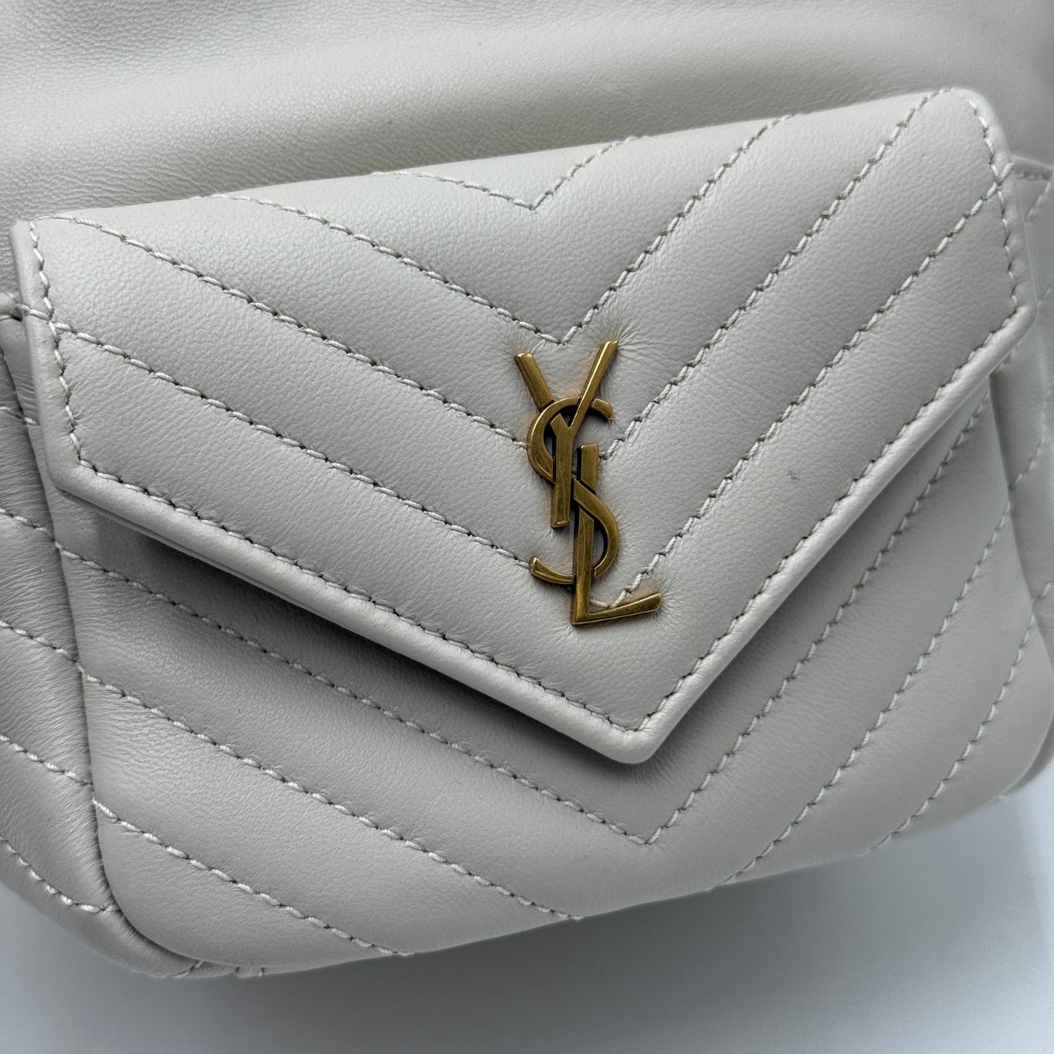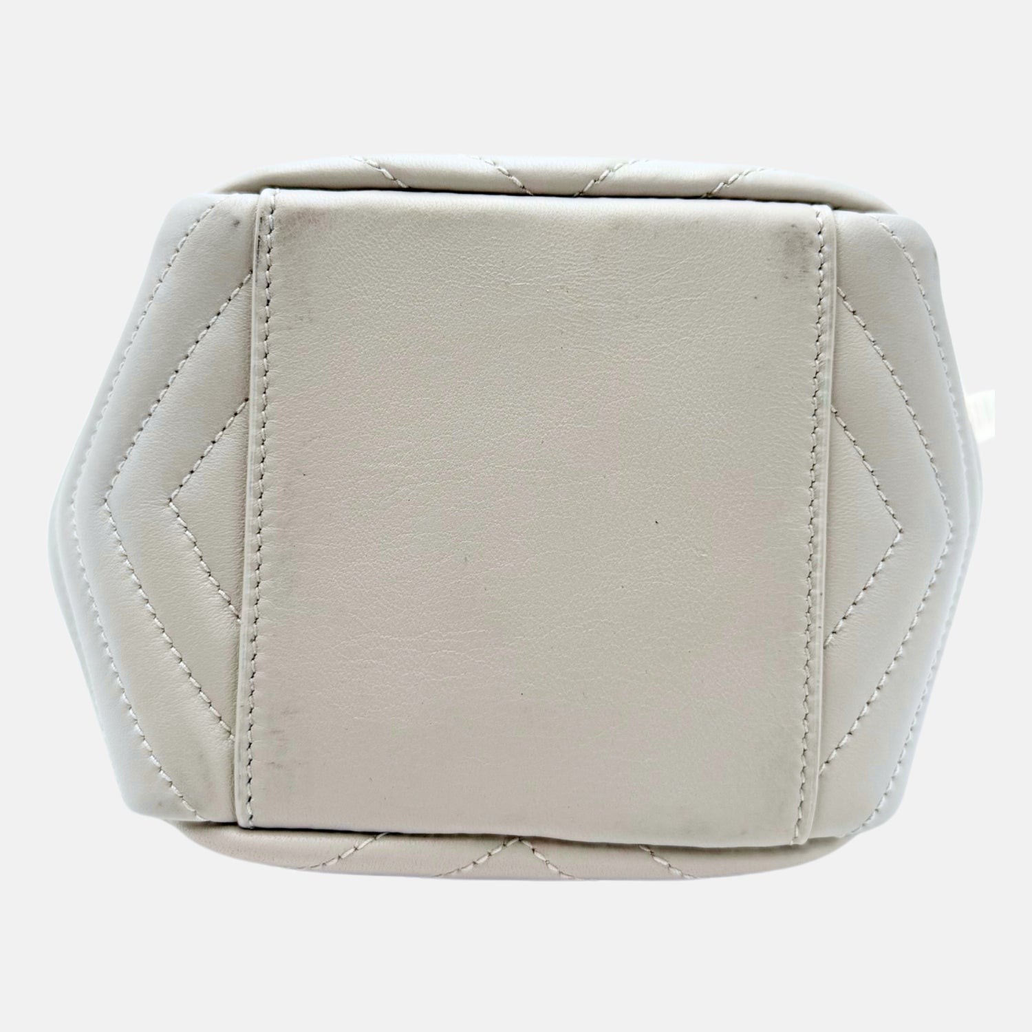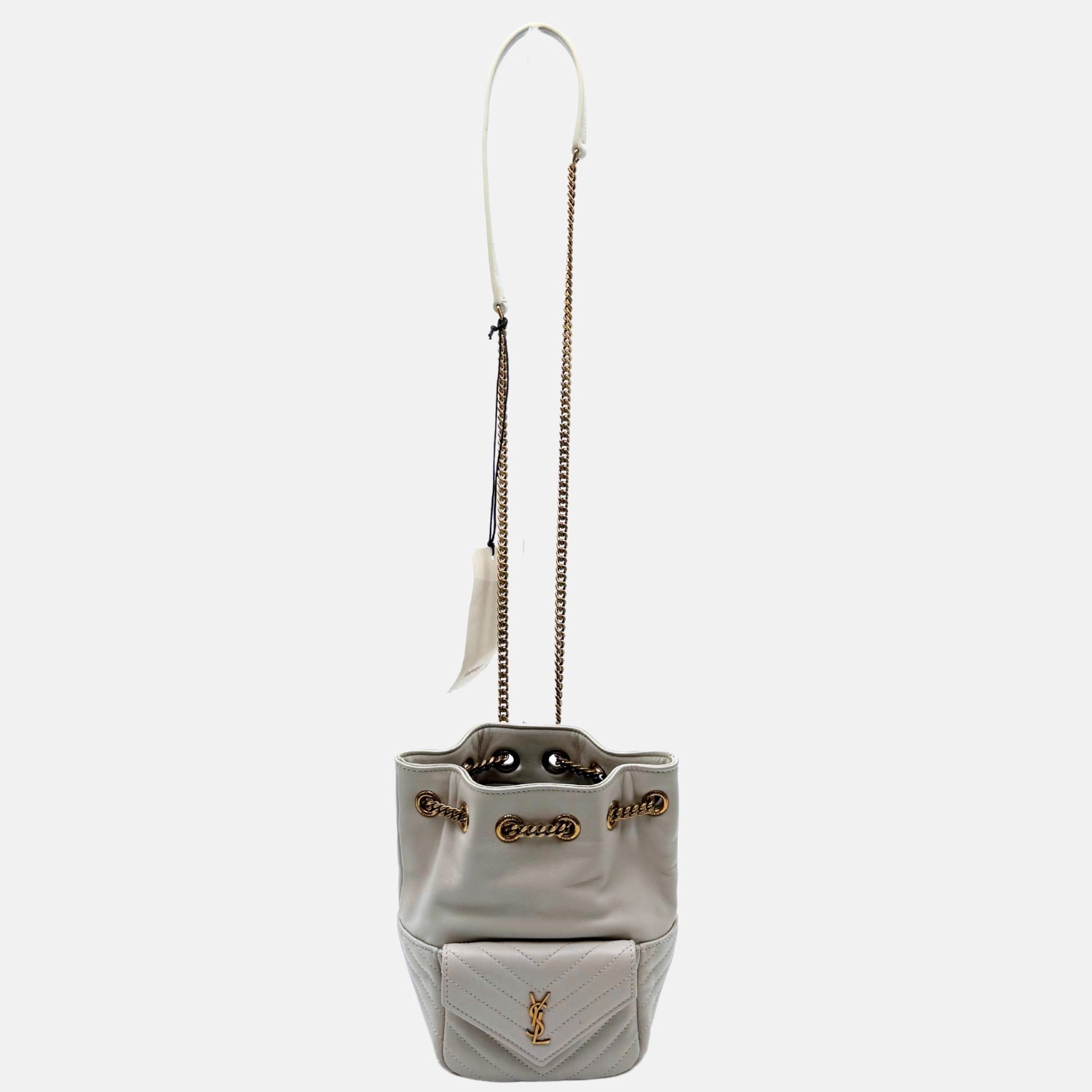 A fresh take on relaxed luxury, the Saint Laurent Jamie Bucket Bag in white quilted lambskin features a soft, supple body with signature chevron stitching and a structured front envelope pocket. Finished with the iconic YSL monogram in gold-tone hardware and matching grommet-and-chain drawstring detailing, this piece balances everyday function with unmistakable brand flair.