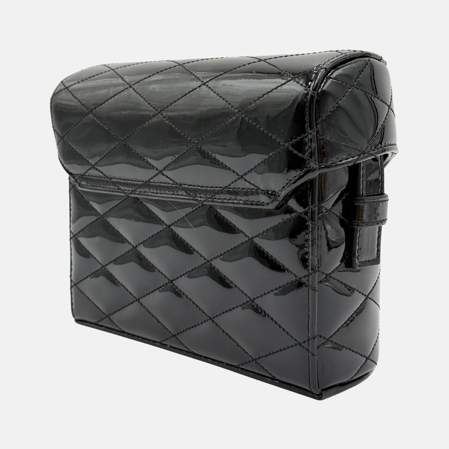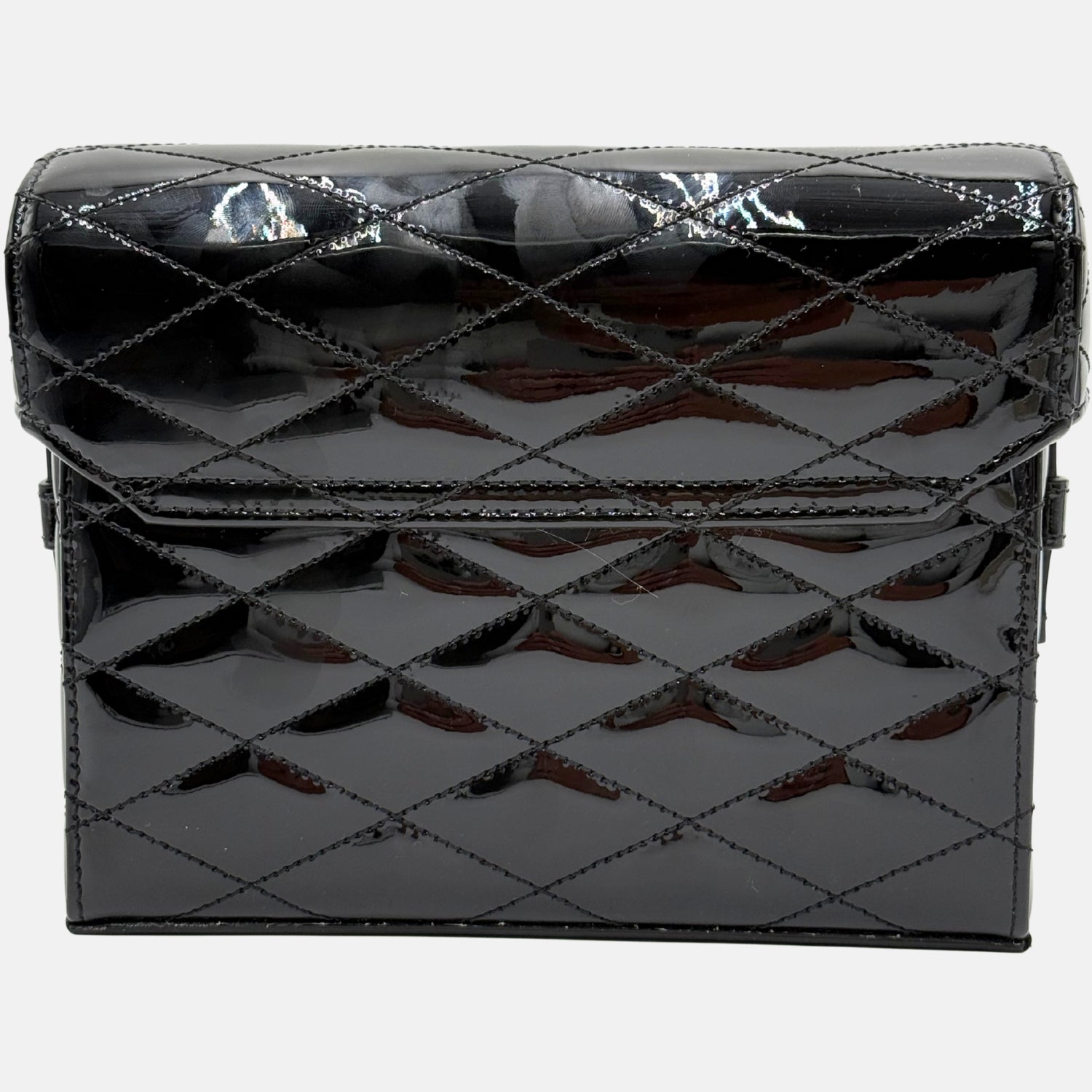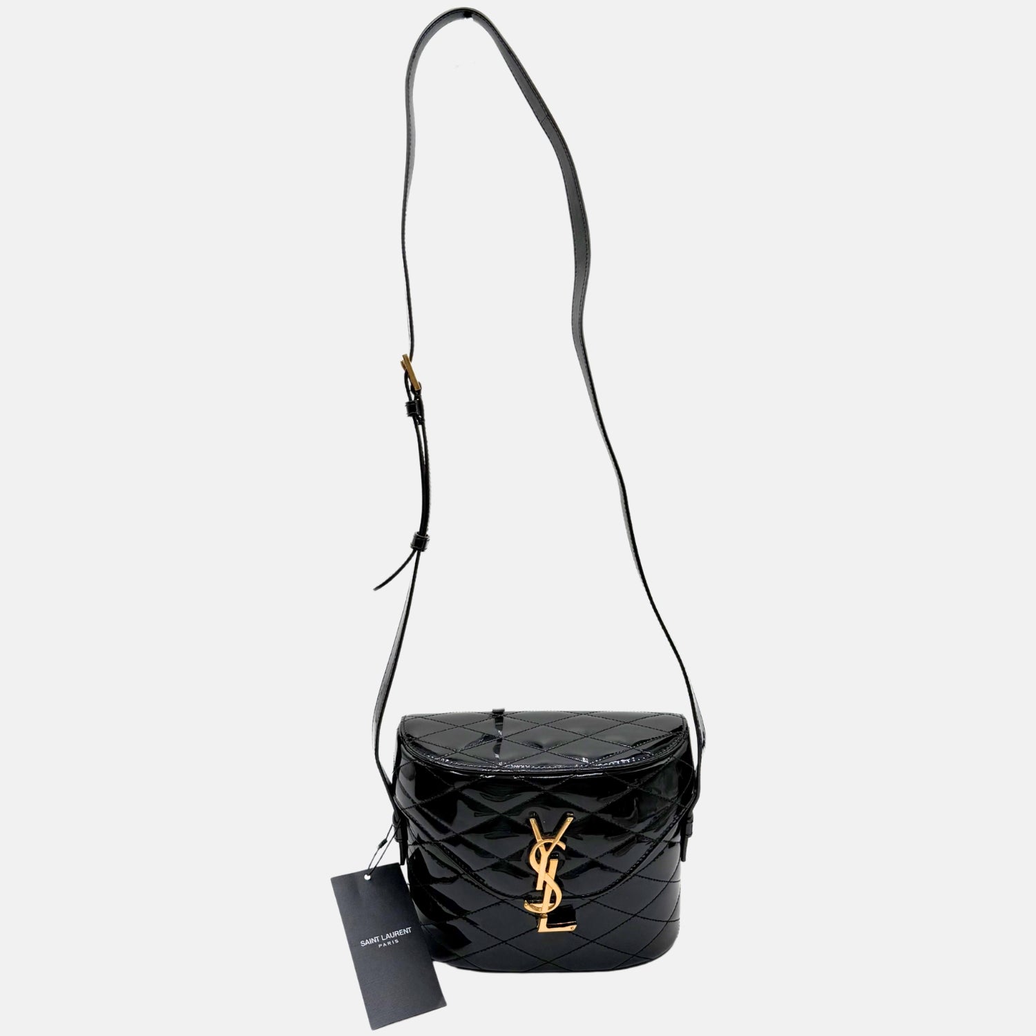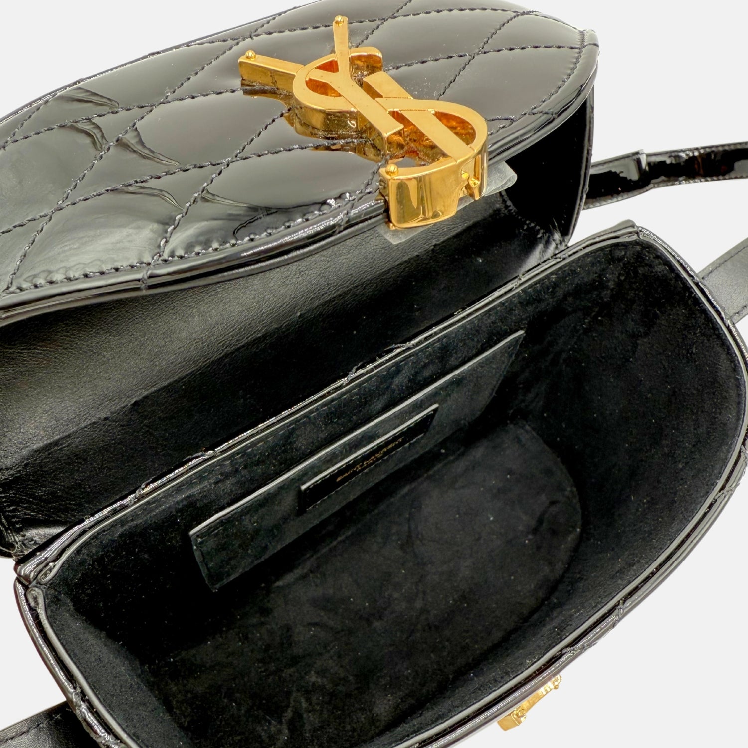 Glossy and structured, the Saint Laurent June Box Bag is crafted from black patent quilted leather and finished with a bold, oversized vertical YSL logo in gold-tone hardware. Its compact, sculptural silhouette features side tab closures and a hinged flap top, making it a statement accessory with vintage-inspired edge and modern polish. Please note, the flap does not close securely and may require adjustment or repair for full functionality.