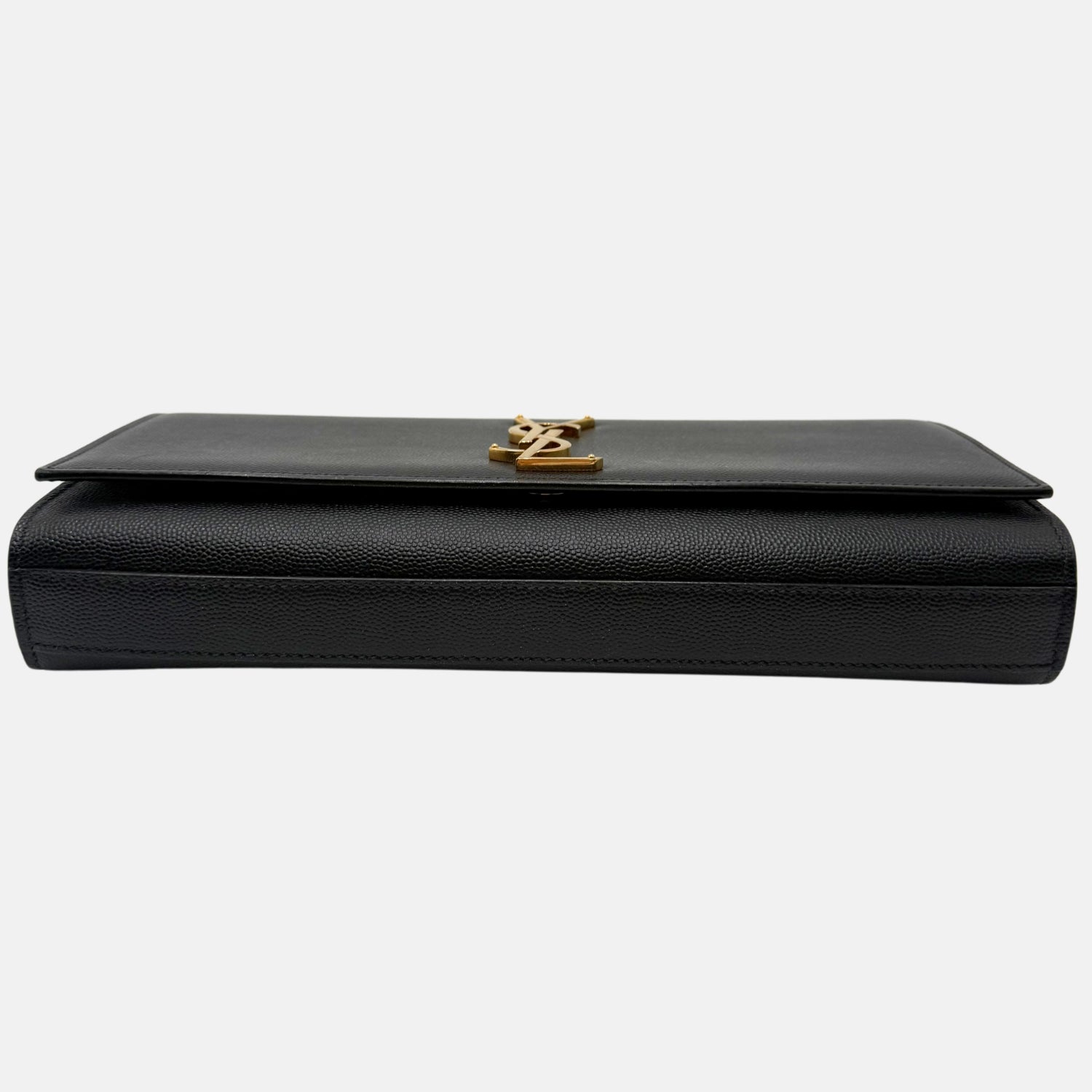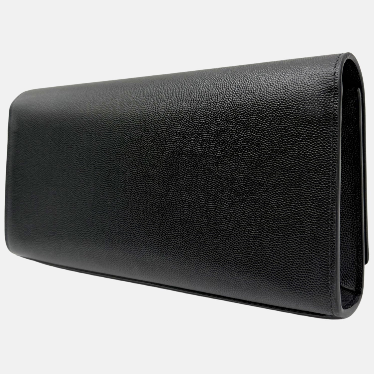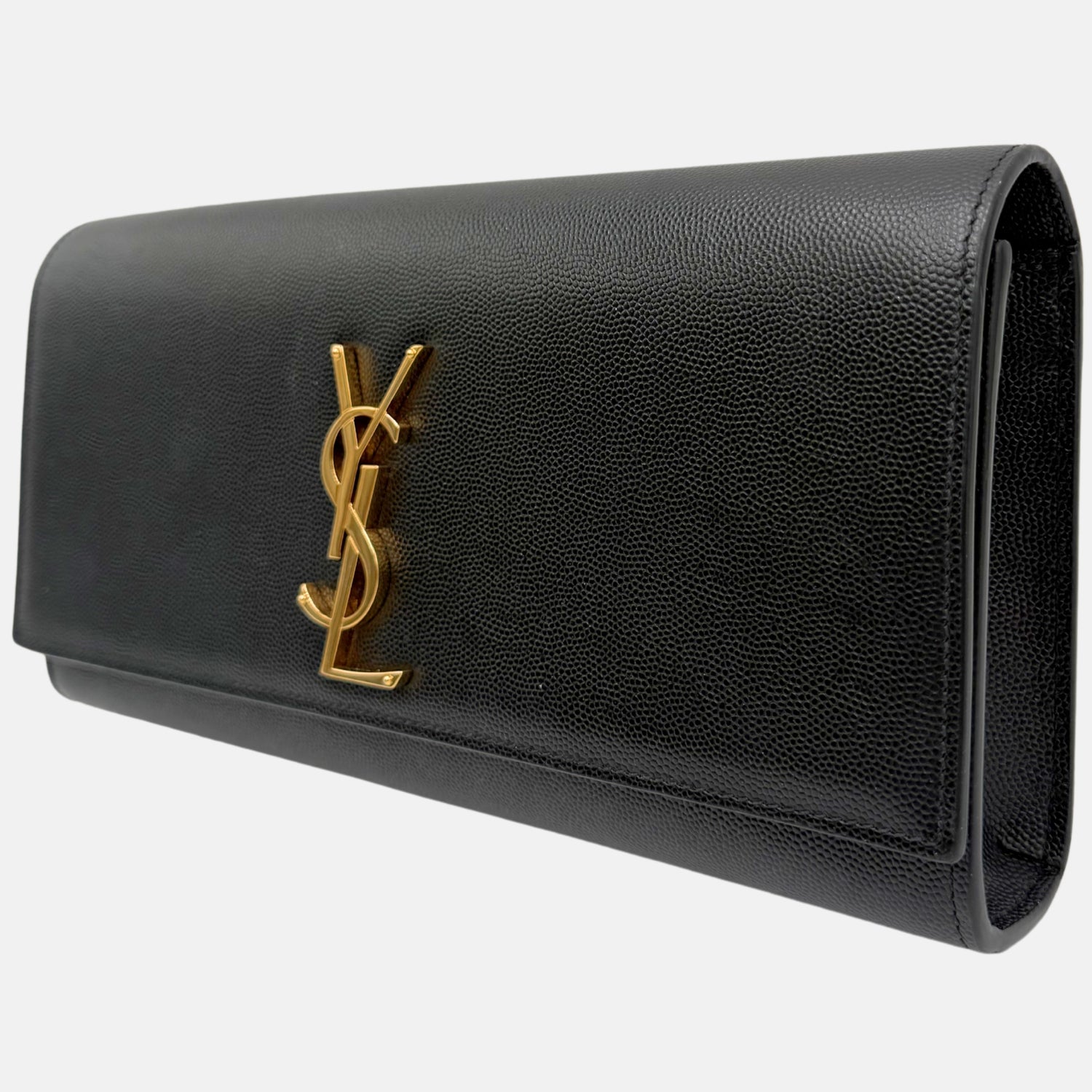 This is the Saint Laurent Monogram Kate Clutch in Black, a sleek evening essential defined by its minimalist silhouette and bold branding. Featuring the iconic gold YSL logo at the front, this structured flap clutch is crafted from finely grained leather for a timeless, elegant finish. It opens to a compact interior sized for cards, a phone, and small essentials—perfect for night-out or formal styling.