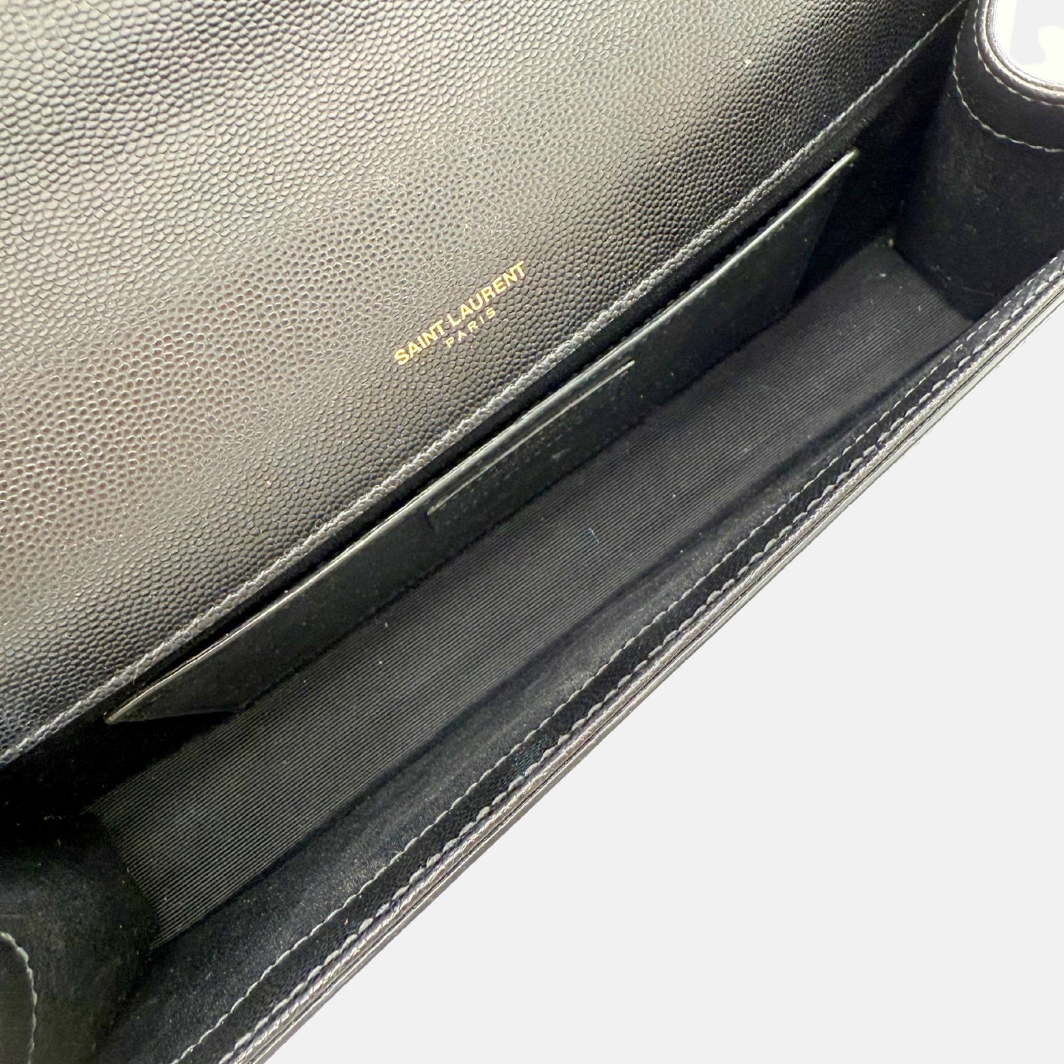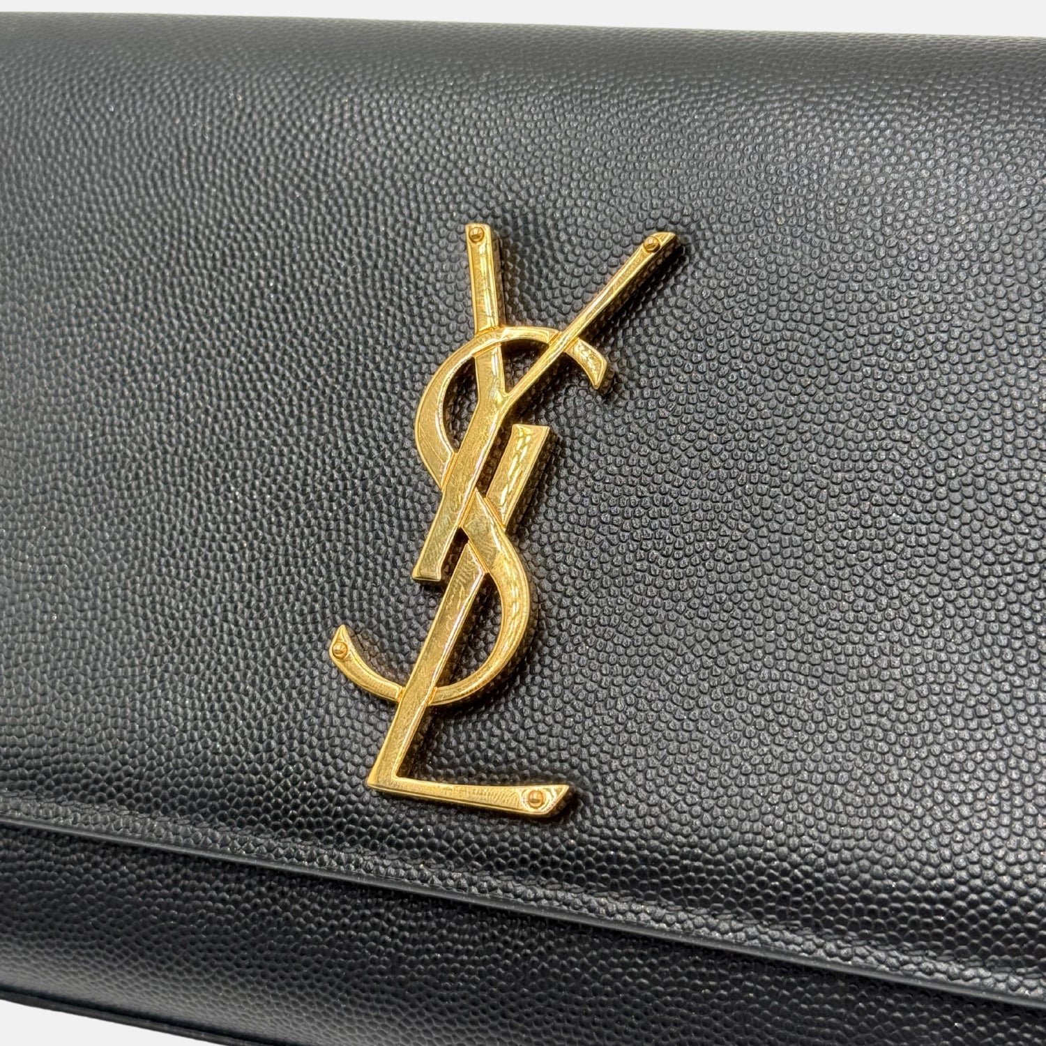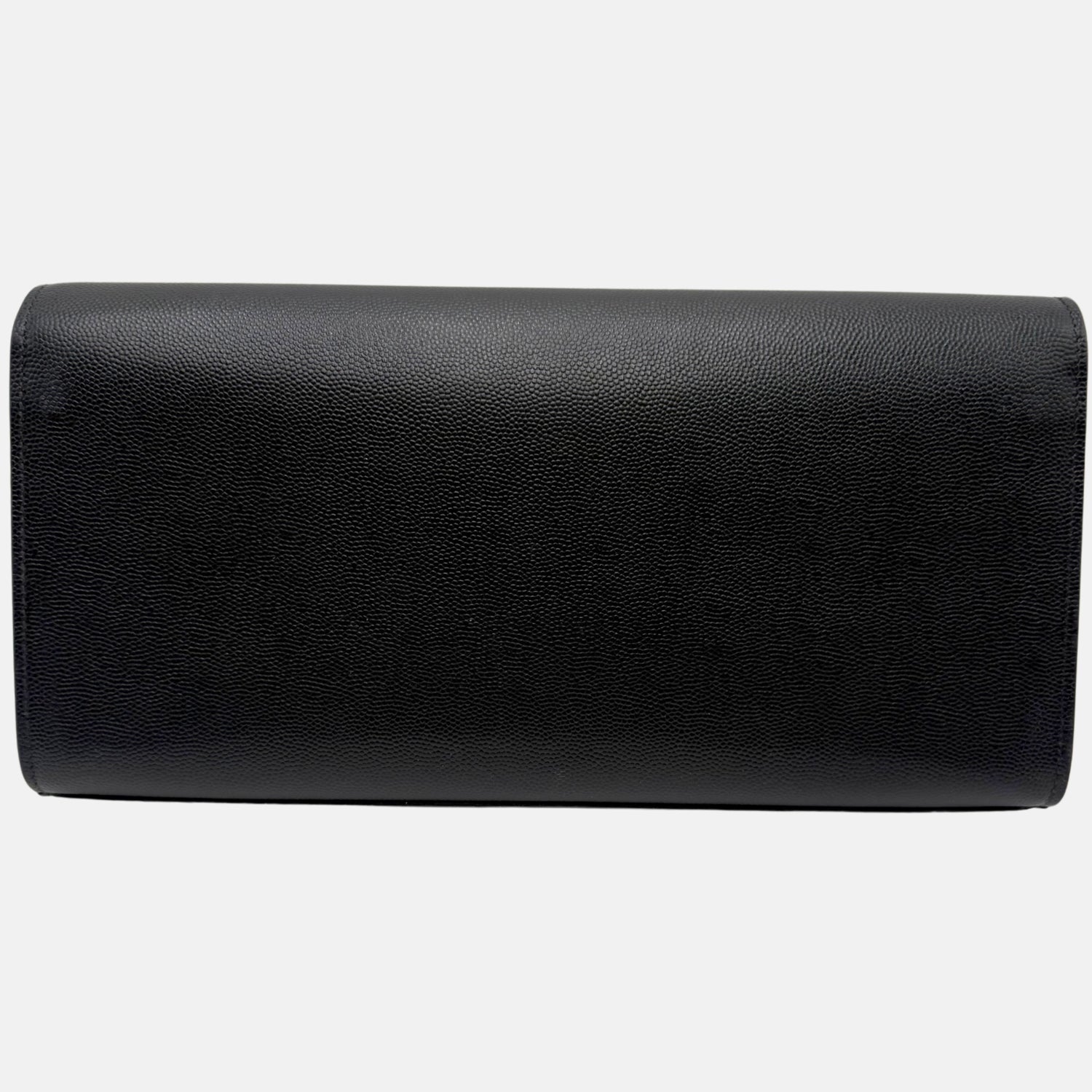 This is the Saint Laurent Monogram Kate Clutch in Black, a sleek evening essential defined by its minimalist silhouette and bold branding. Featuring the iconic gold YSL logo at the front, this structured flap clutch is crafted from finely grained leather for a timeless, elegant finish. It opens to a compact interior sized for cards, a phone, and small essentials—perfect for night-out or formal styling.