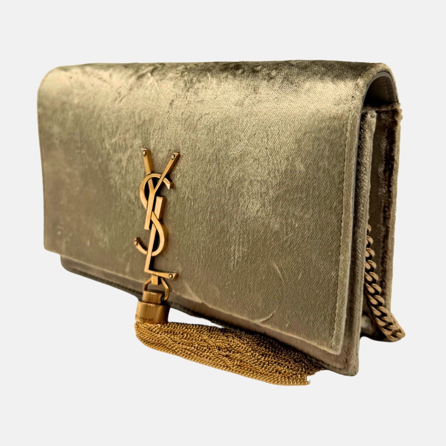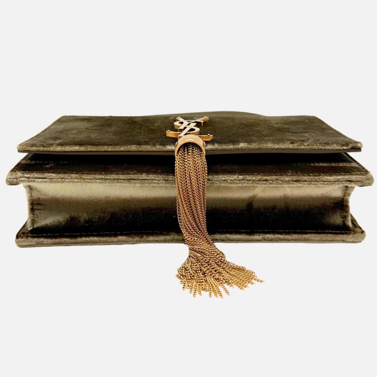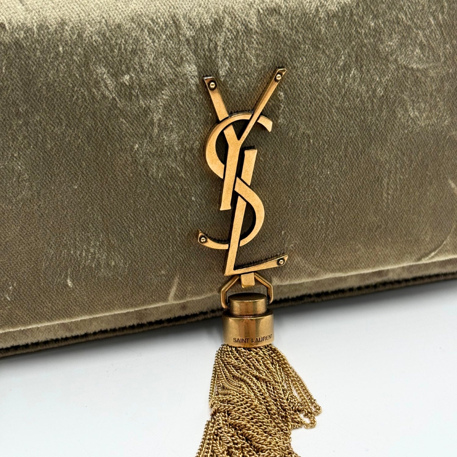 The Saint Laurent Kate Tassel Crossbody Bag Olive Velvet Medium brings rich texture and statement detail to a timeless silhouette. Crafted in plush olive velvet, it features the iconic gold YSL monogram with an elegant chain tassel accent and matching gold chain strap for crossbody wear. The structured envelope shape and magnetic flap closure offer sleek sophistication, making this a standout piece for evenings, events, or holiday dressing.