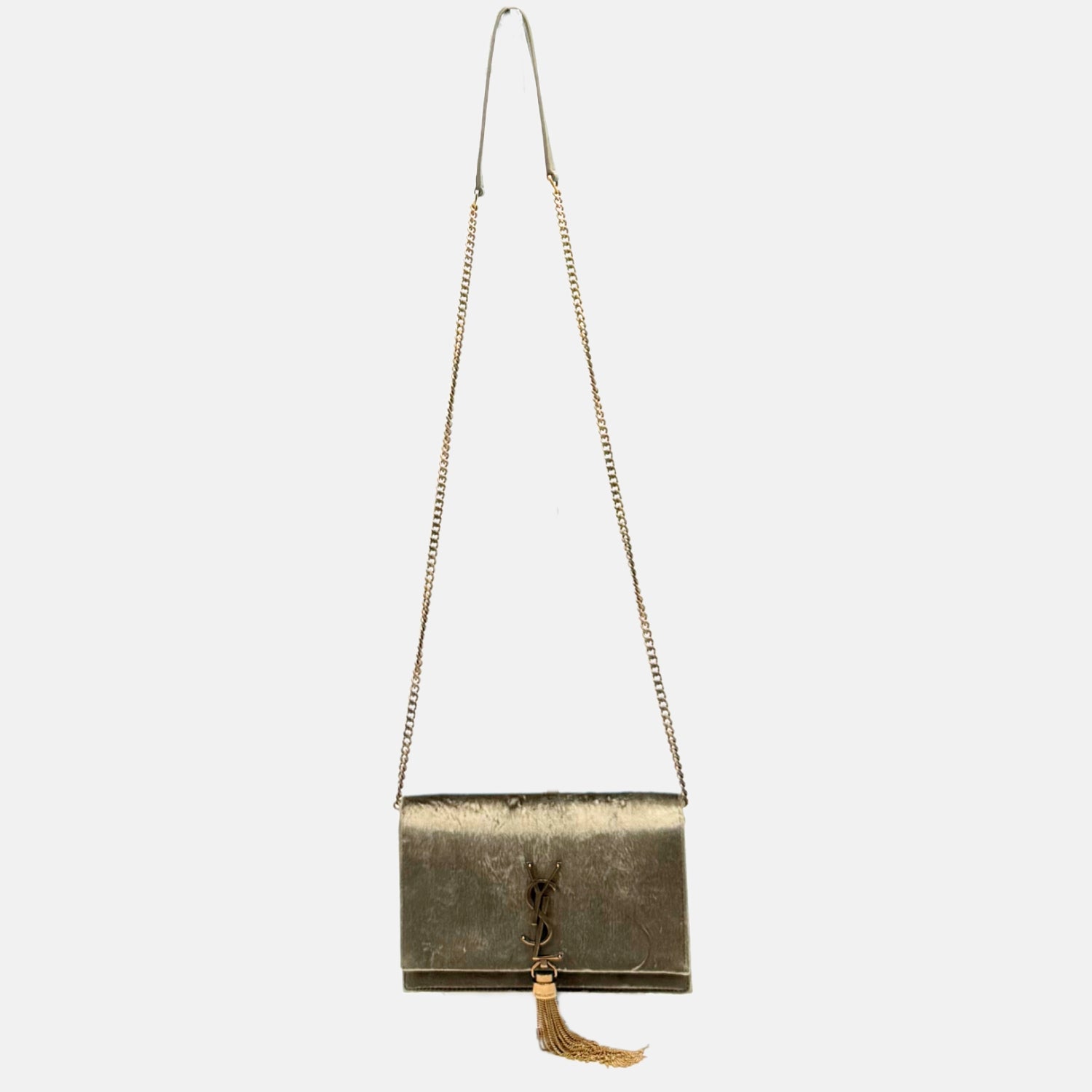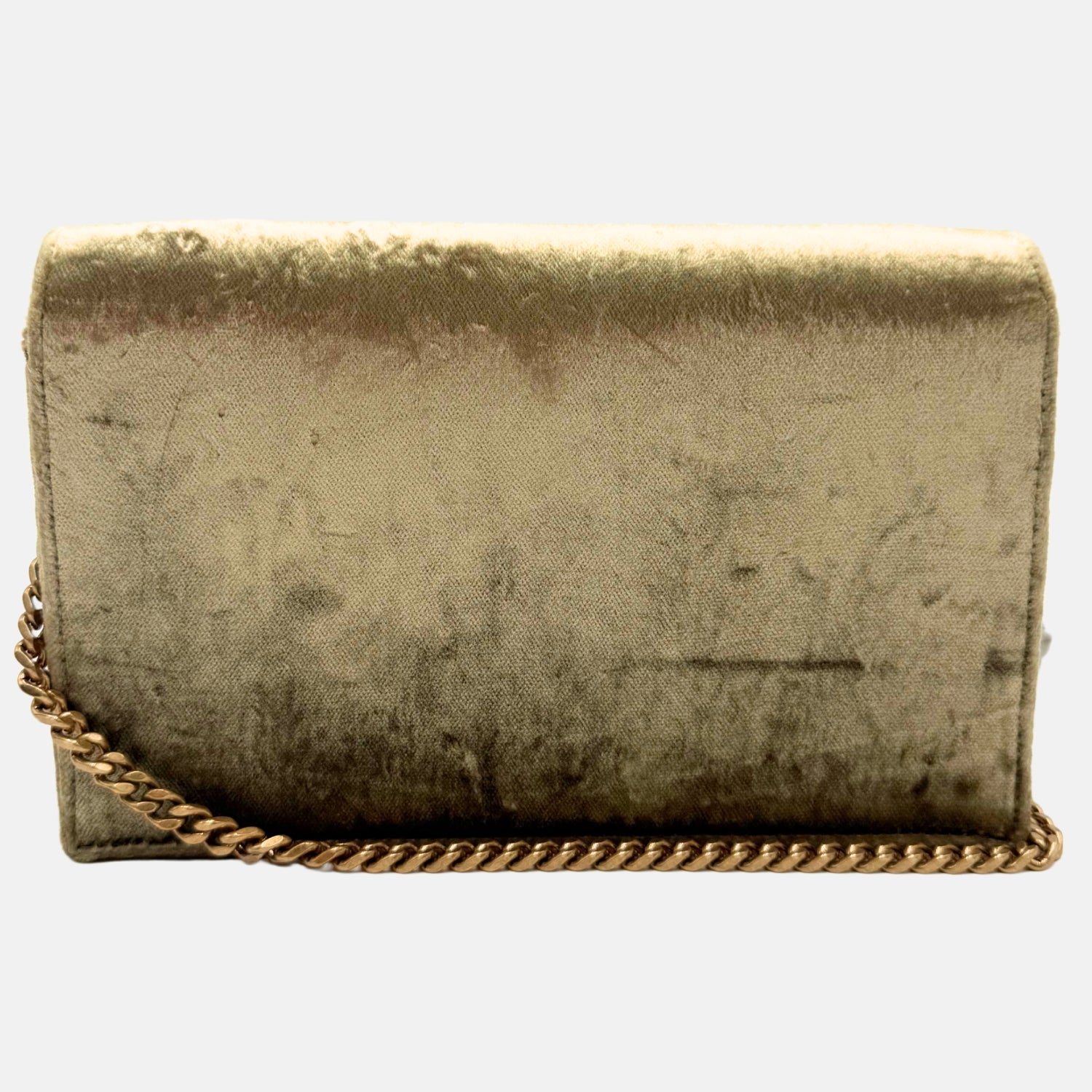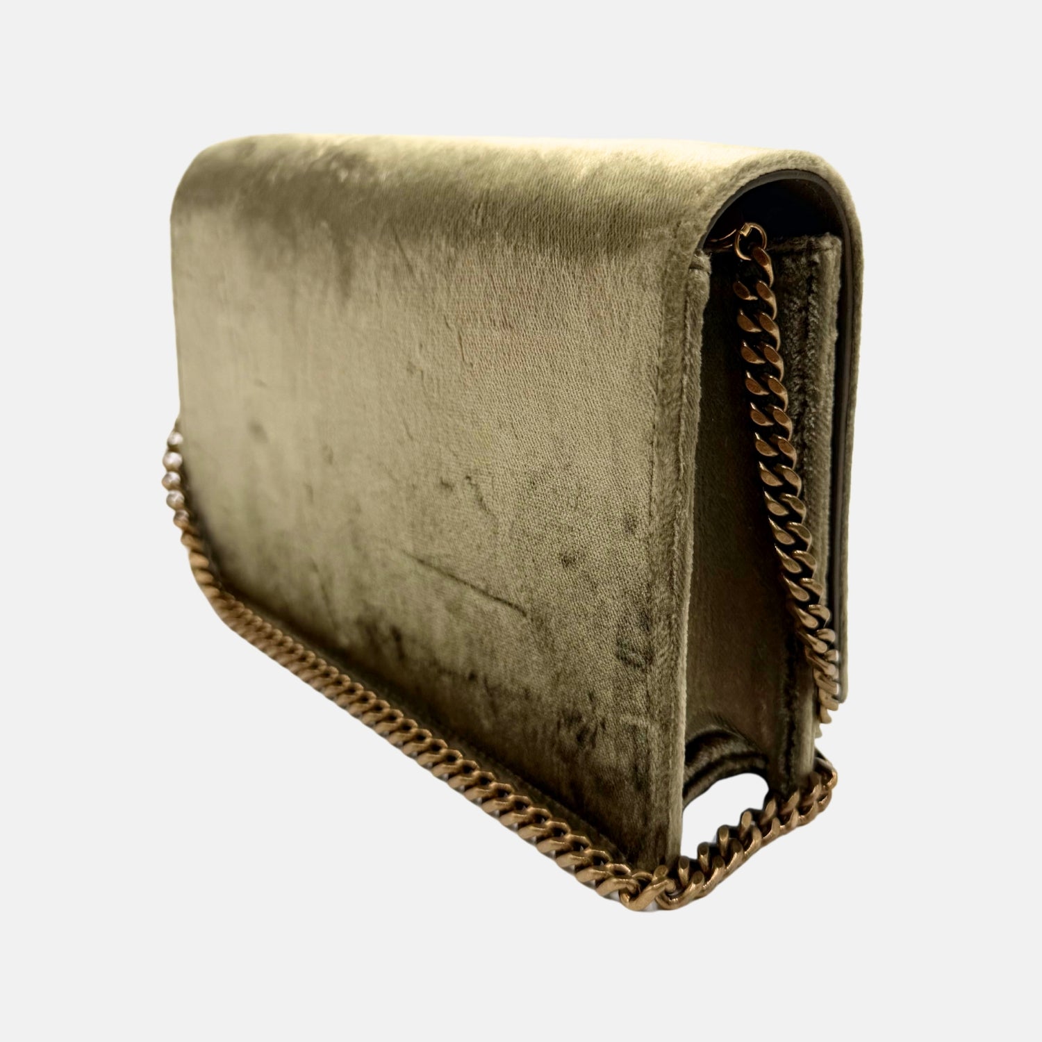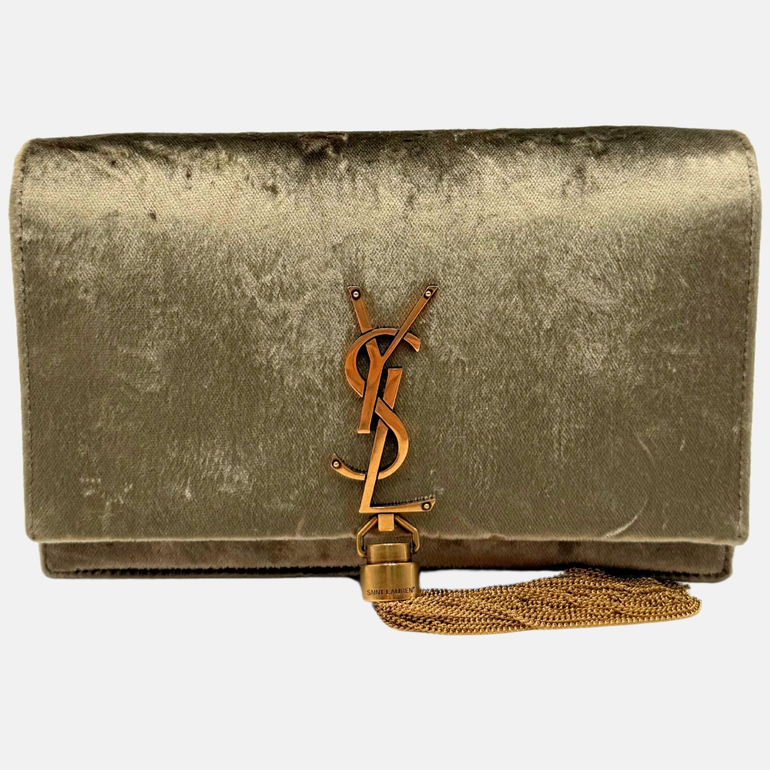 The Saint Laurent Kate Tassel Crossbody Bag Olive Velvet Medium brings rich texture and statement detail to a timeless silhouette. Crafted in plush olive velvet, it features the iconic gold YSL monogram with an elegant chain tassel accent and matching gold chain strap for crossbody wear. The structured envelope shape and magnetic flap closure offer sleek sophistication, making this a standout piece for evenings, events, or holiday dressing.