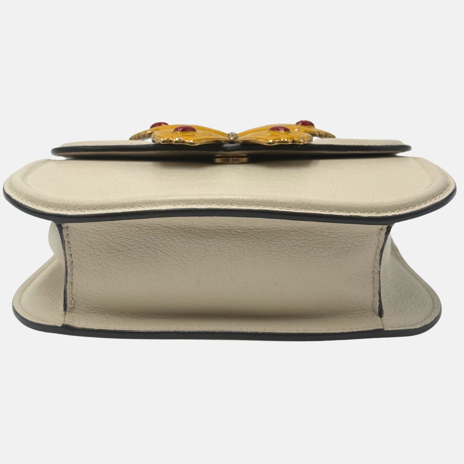 Playful yet unmistakably Gucci, this white leather crossbody features the brand’s signature red and navy Web stripe along the flap, adorned with a standout yellow enamel butterfly clasp accented with red cabochon studs. Crafted in smooth leather with rounded edges, it brings a whimsical twist to the classic Ophidia silhouette.