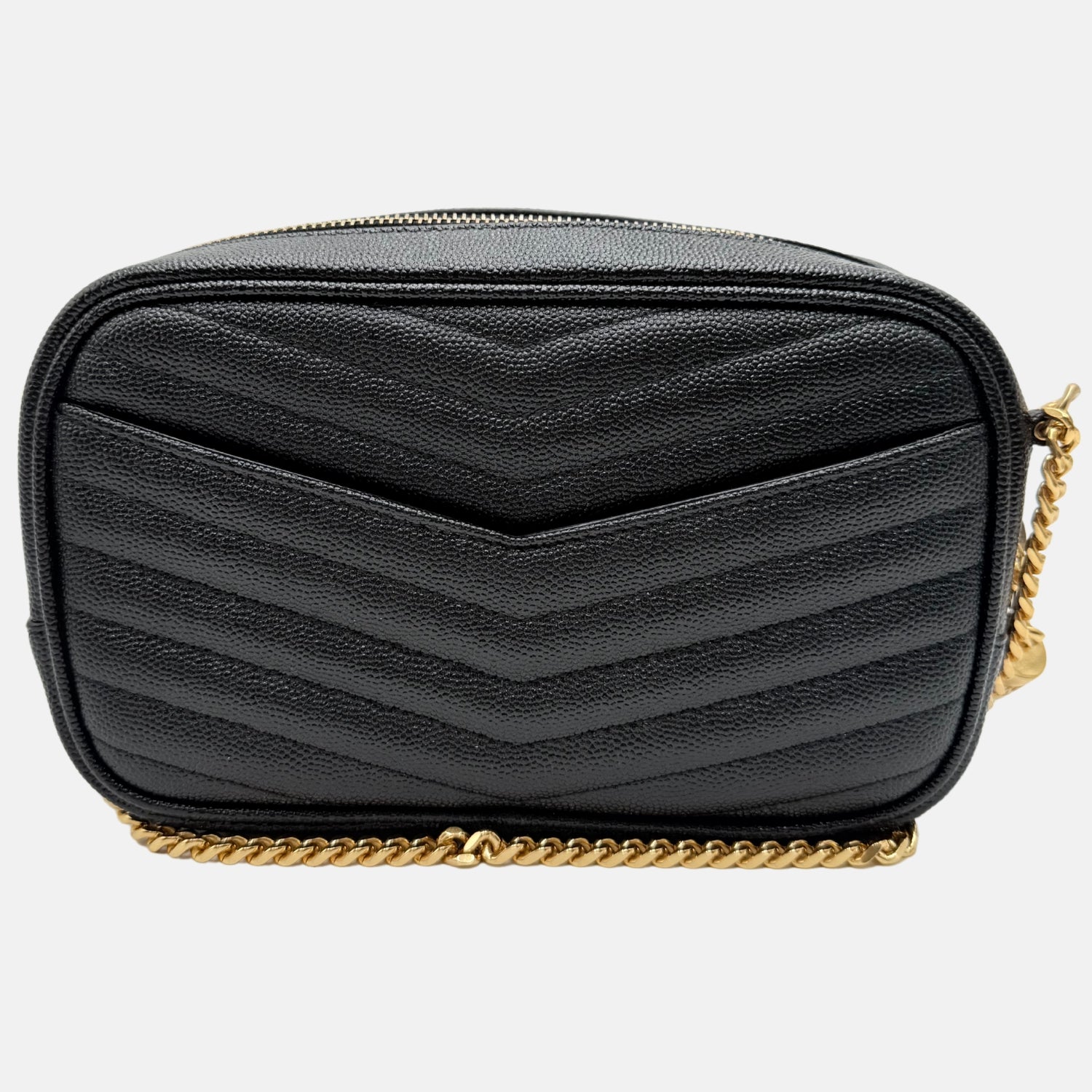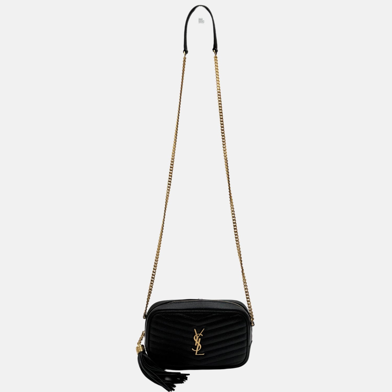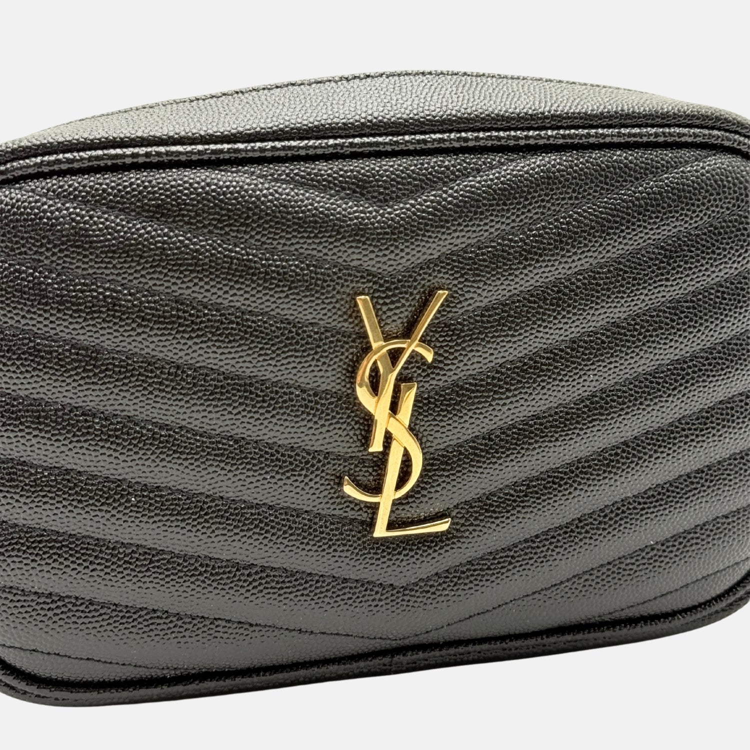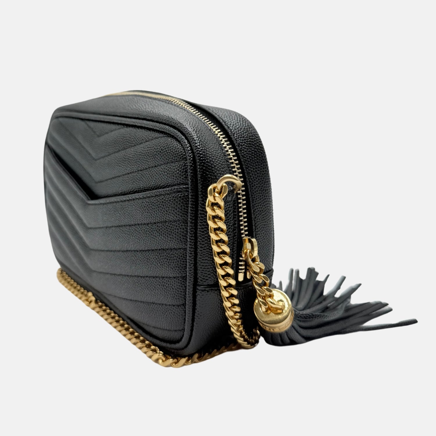 The Saint Laurent Lou Camera Bag Black Chevron Quilted Leather Small is a cult favorite that blends sleek utility with signature branding. Crafted from durable black grained leather with chevron quilting, it features a bold gold YSL monogram, coordinating chain and leather strap, and a playful leather tassel. Compact but practical, this crossbody is perfect for carrying daily essentials with effortless polish from day to night.