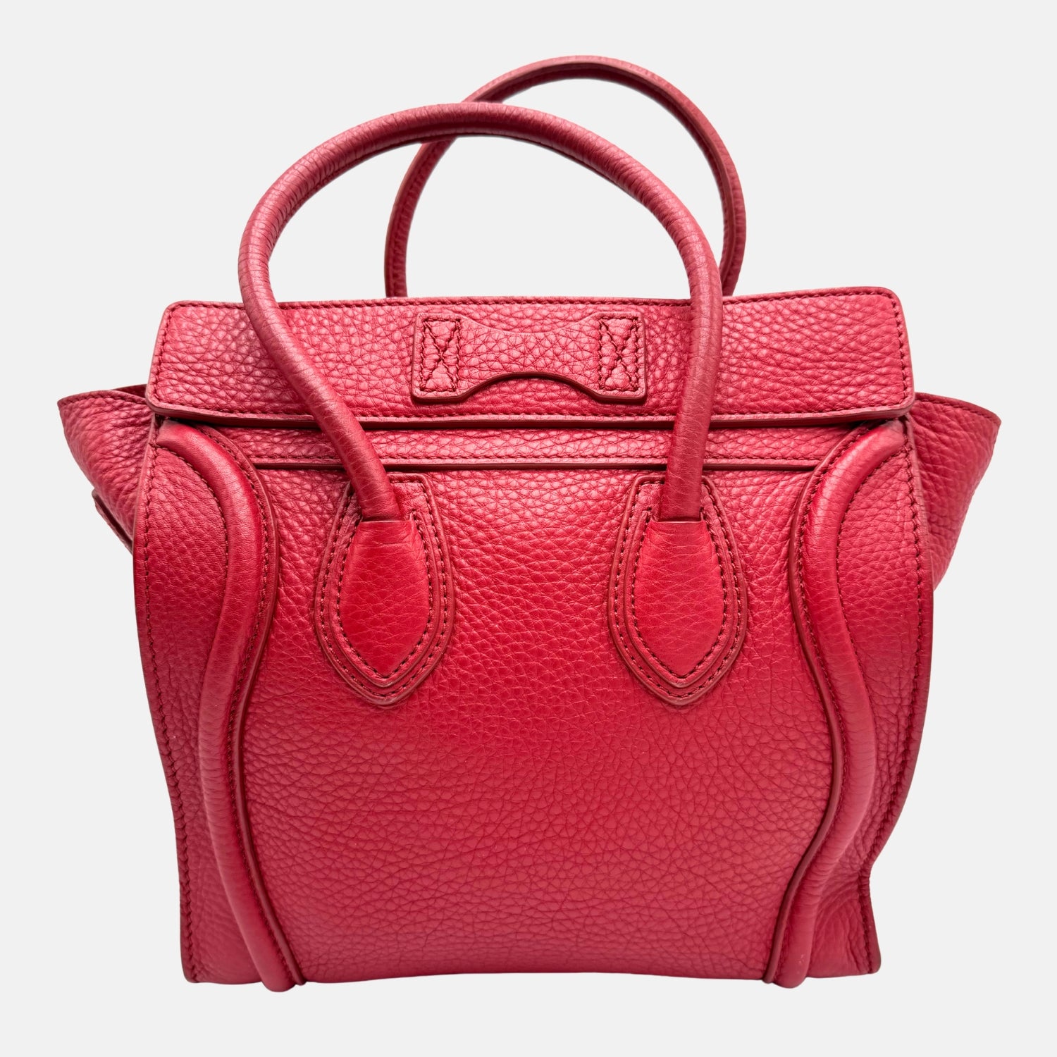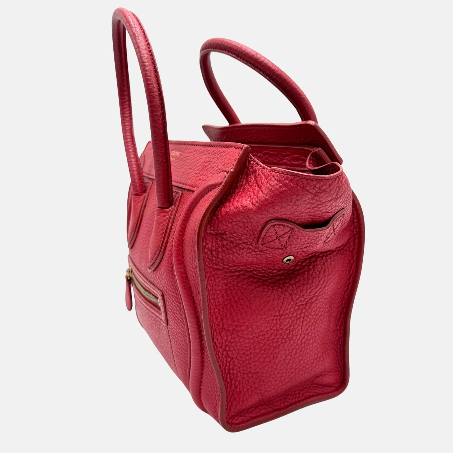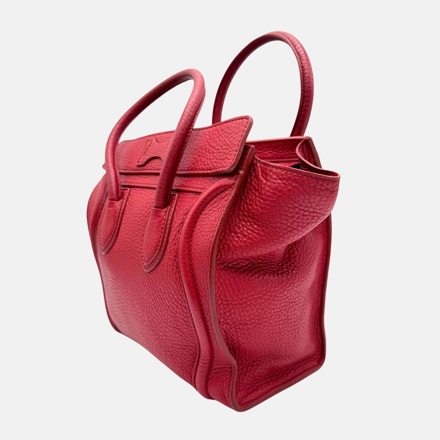 An iconic design from the Phoebe Philo era, the Céline Luggage Tote is instantly recognizable by its structured silhouette, curved piping, and winged sides. This version is crafted from vibrant red grained leather and finished with gold-tone hardware, rolled leather handles, and a front zip pocket. A standout piece that balances architectural elegance with everyday practicality.