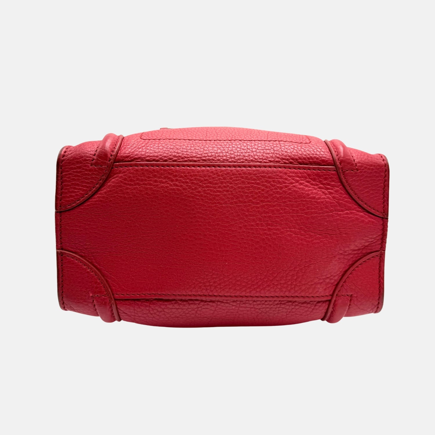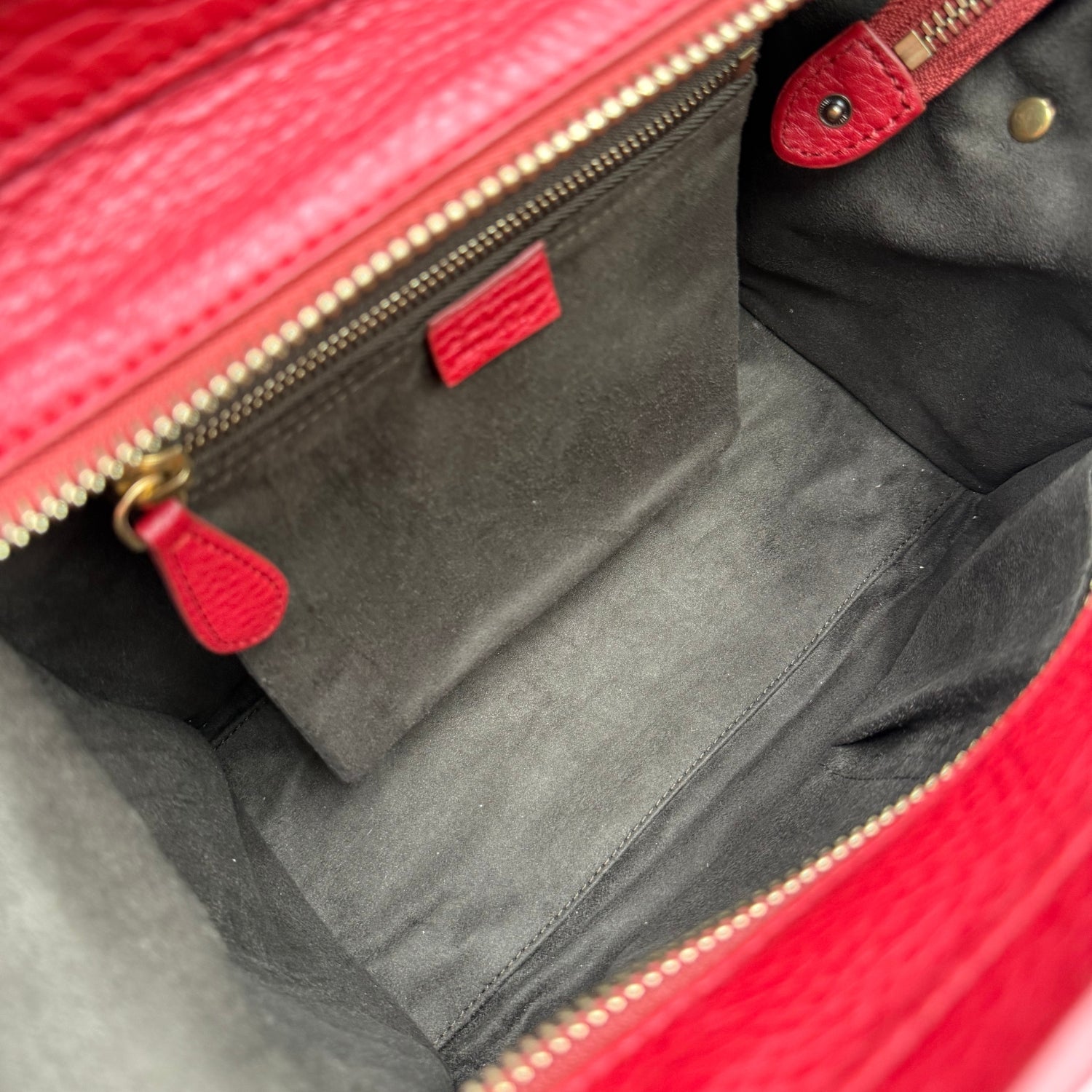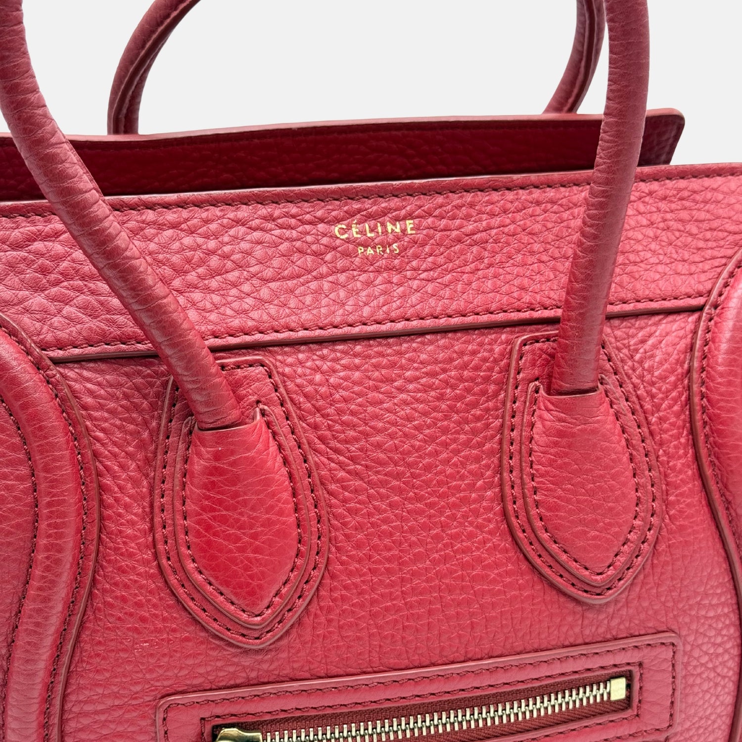 An iconic design from the Phoebe Philo era, the Céline Luggage Tote is instantly recognizable by its structured silhouette, curved piping, and winged sides. This version is crafted from vibrant red grained leather and finished with gold-tone hardware, rolled leather handles, and a front zip pocket. A standout piece that balances architectural elegance with everyday practicality.