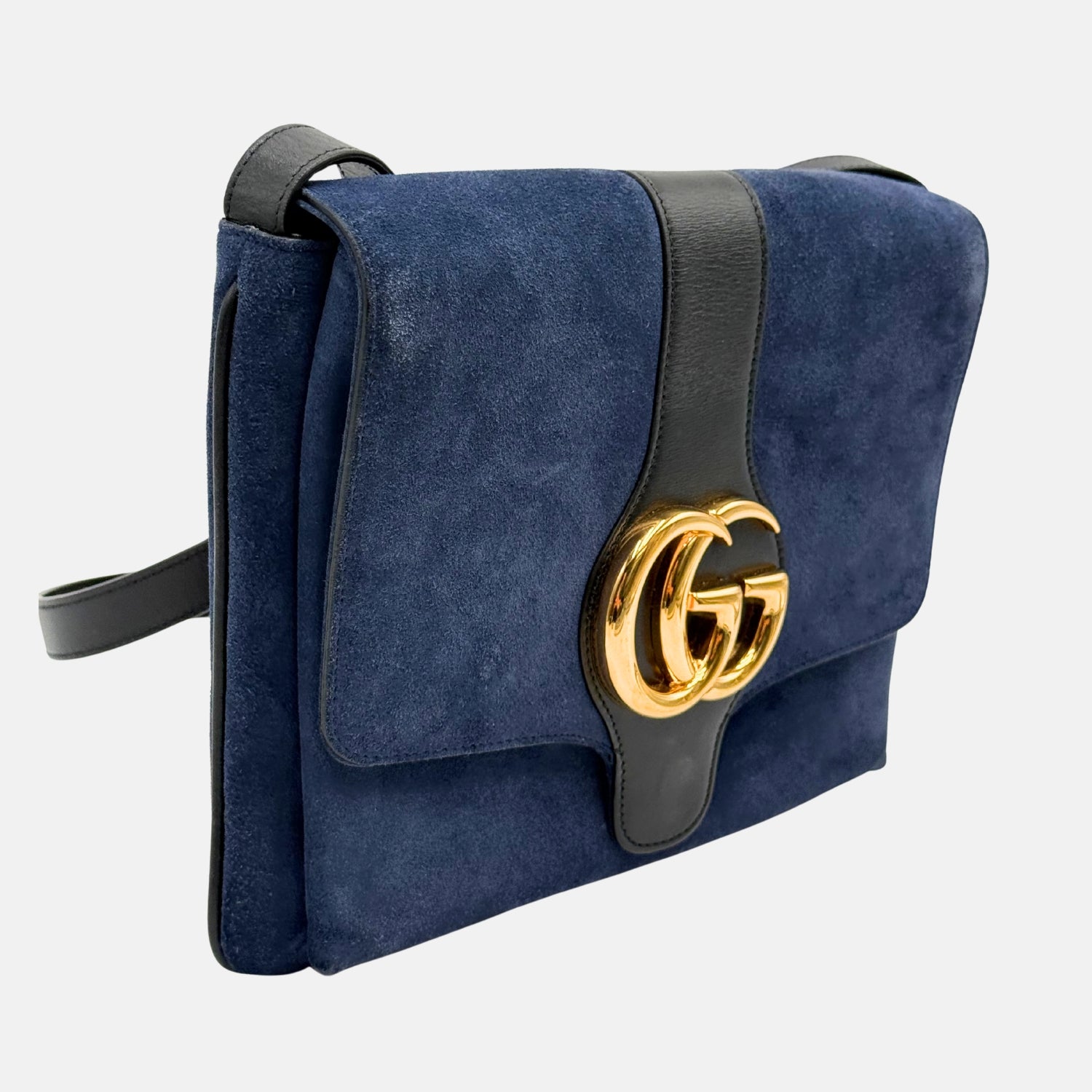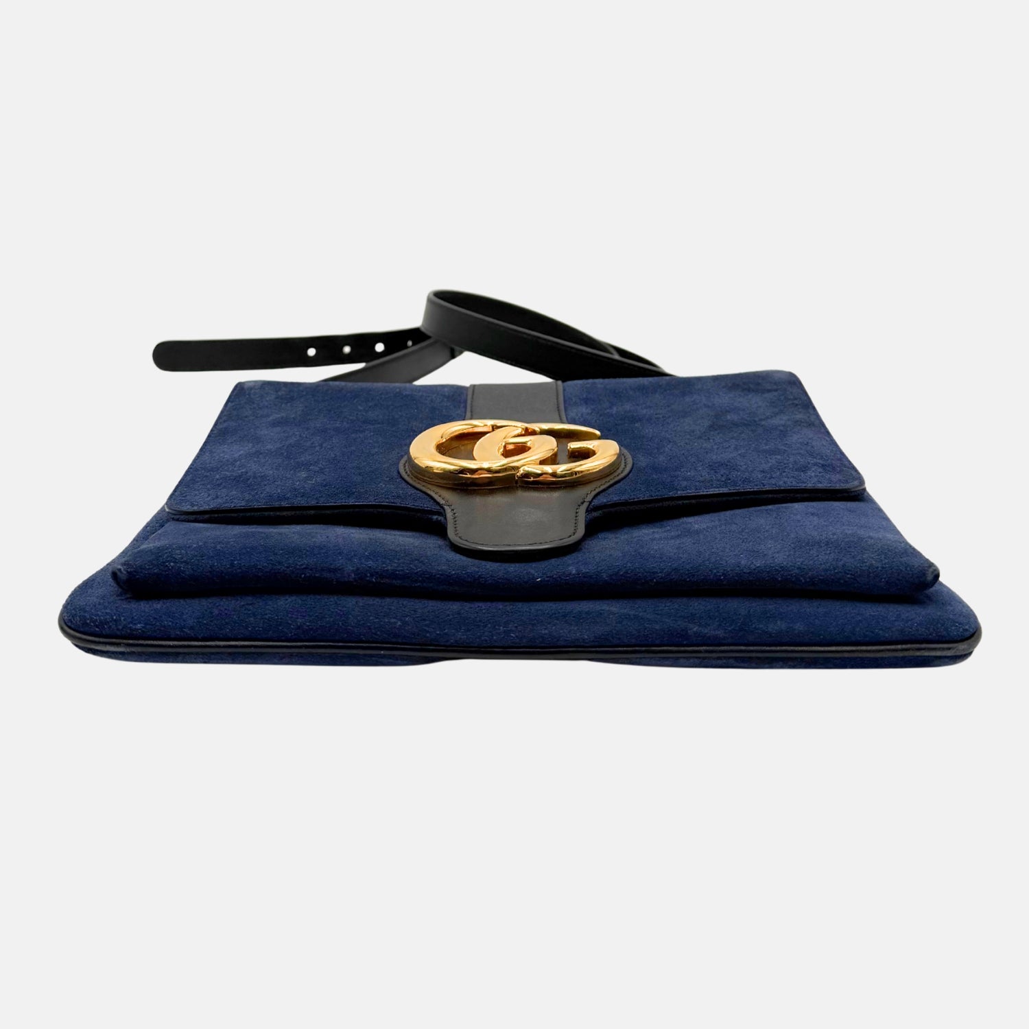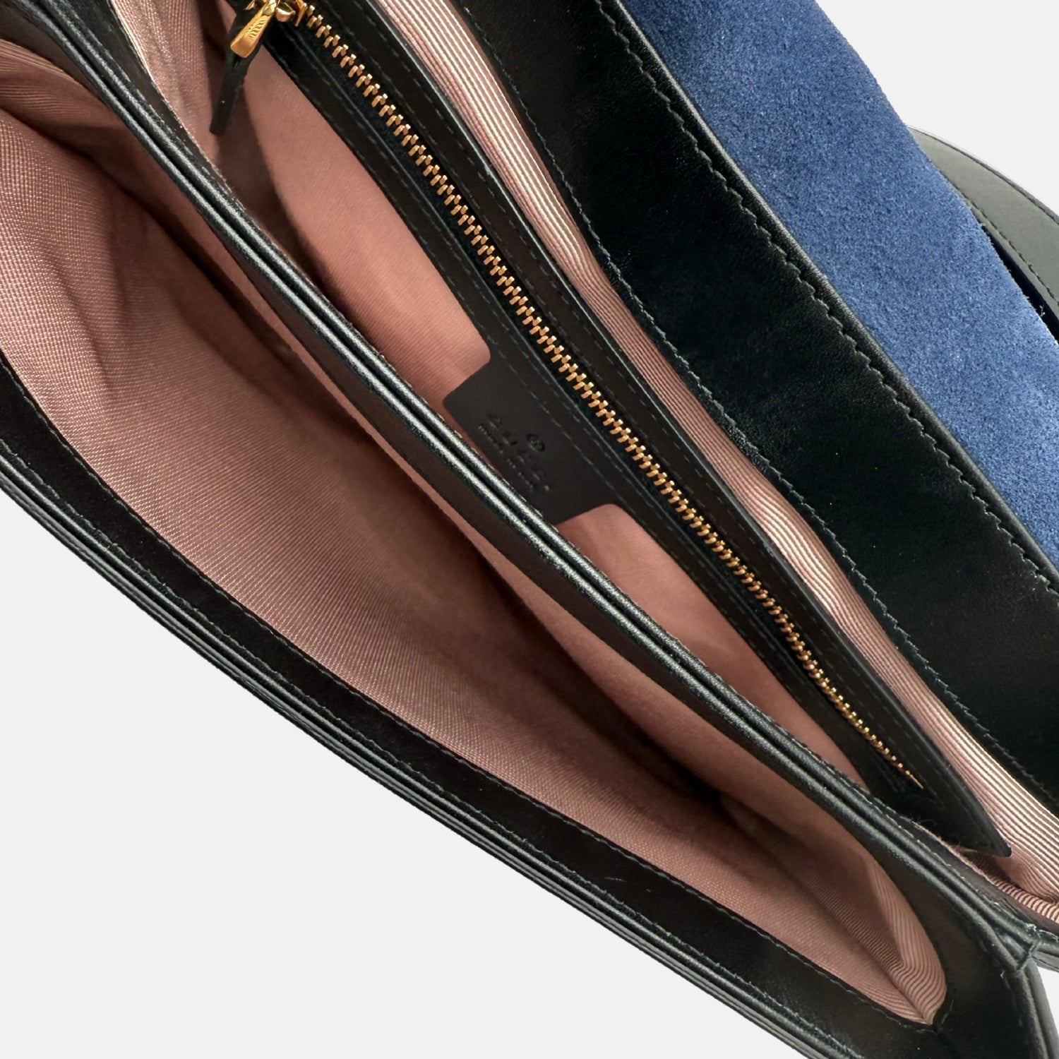 Rich in texture and iconic in design, this navy suede Gucci shoulder bag is part of the beloved GG Marmont line. The structured silhouette is accented by smooth black leather trim and an oversized gold-tone GG logo closure. With its vintage-inspired flair and luxurious materials, this small bag blends everyday functionality with timeless Italian craftsmanship.