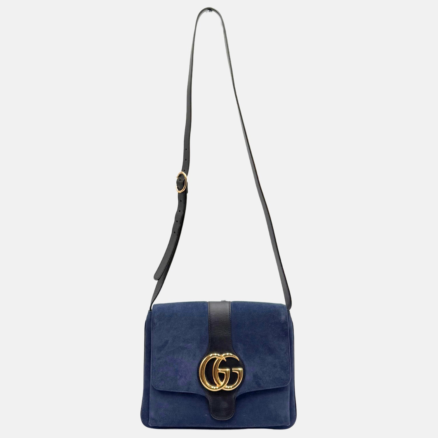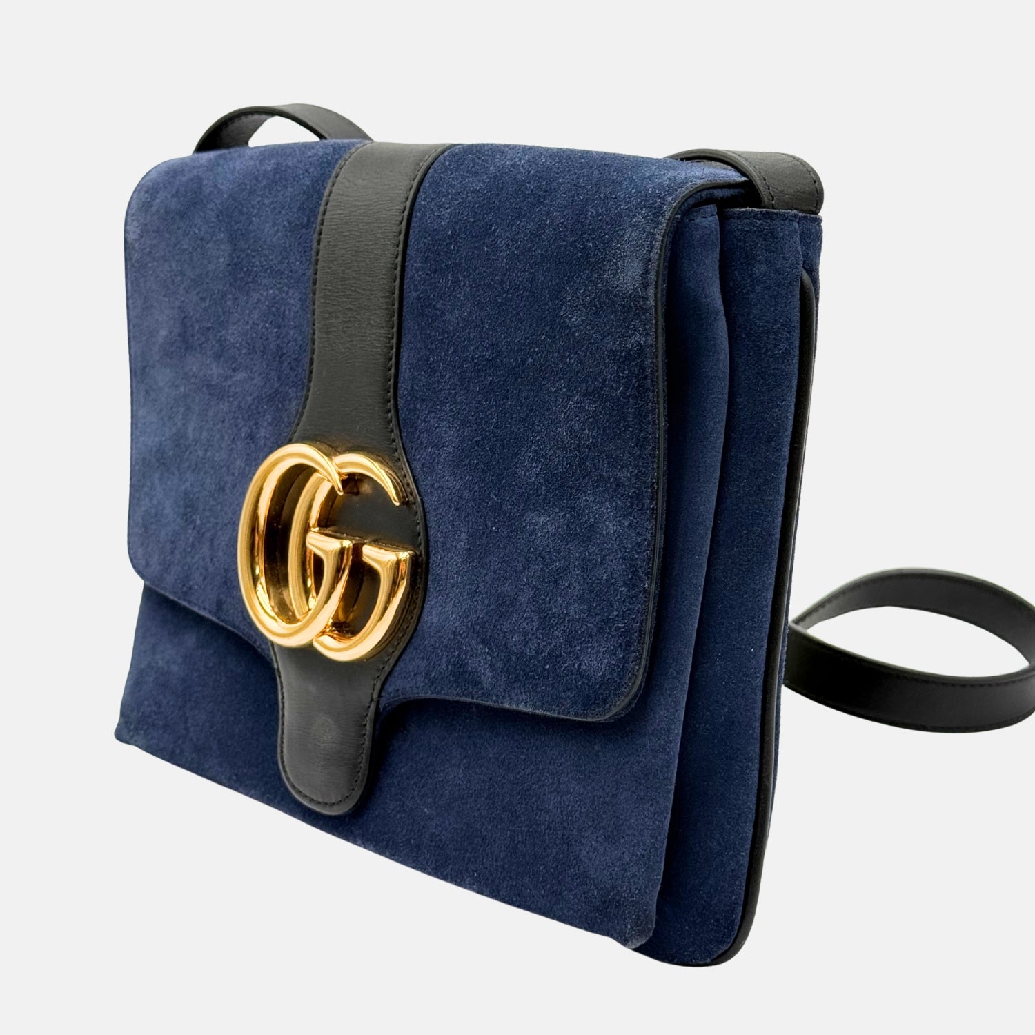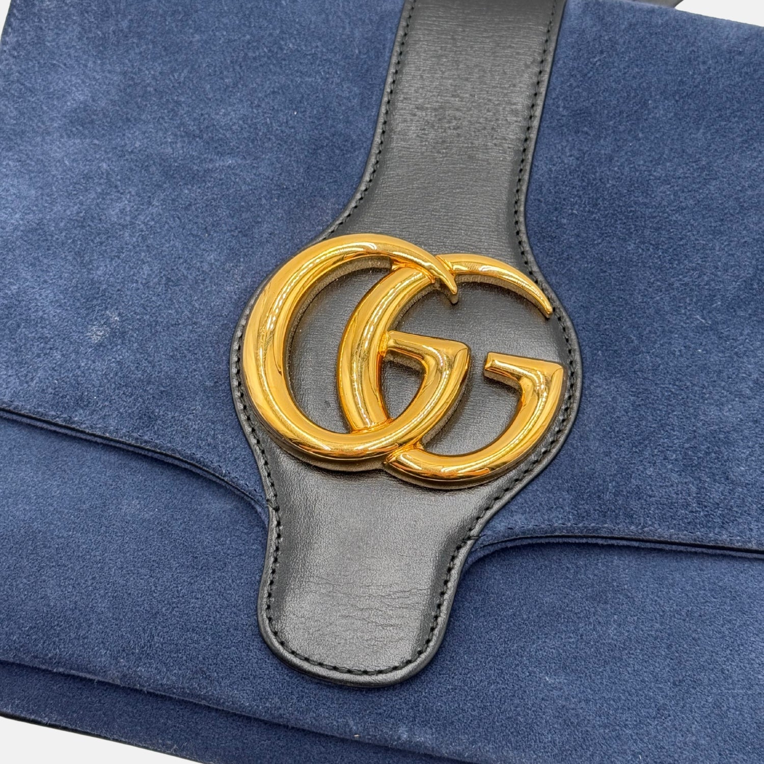 Rich in texture and iconic in design, this navy suede Gucci shoulder bag is part of the beloved GG Marmont line. The structured silhouette is accented by smooth black leather trim and an oversized gold-tone GG logo closure. With its vintage-inspired flair and luxurious materials, this small bag blends everyday functionality with timeless Italian craftsmanship.