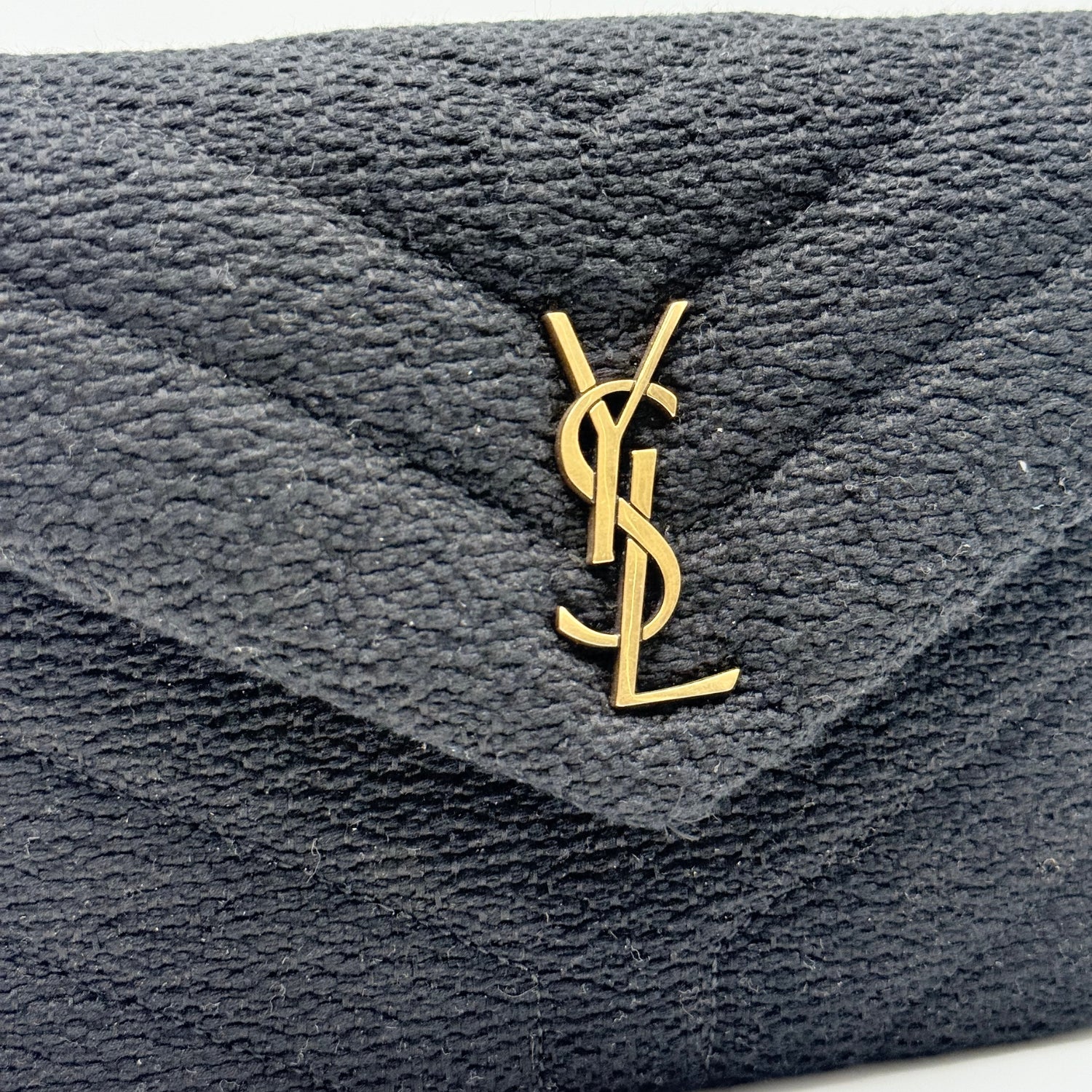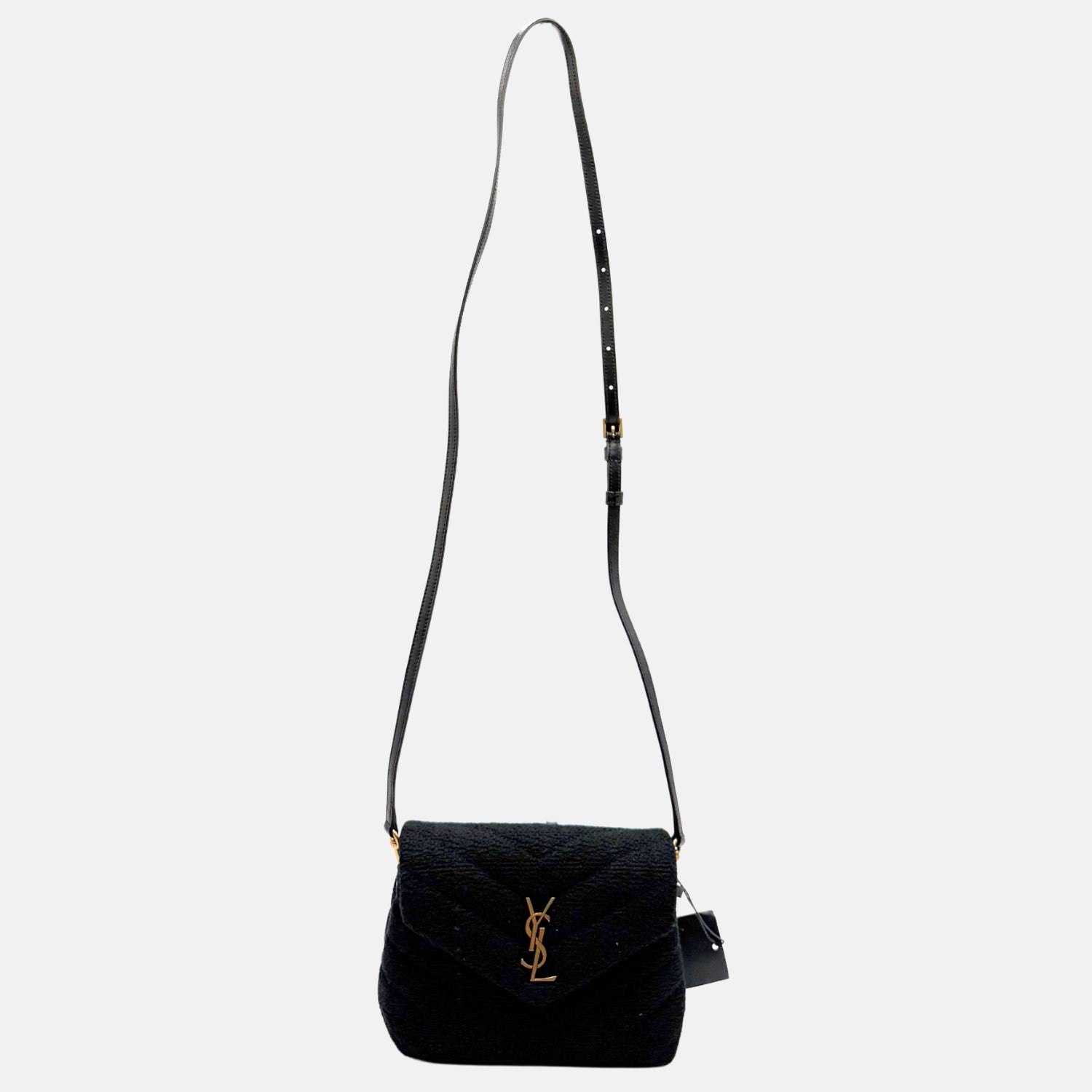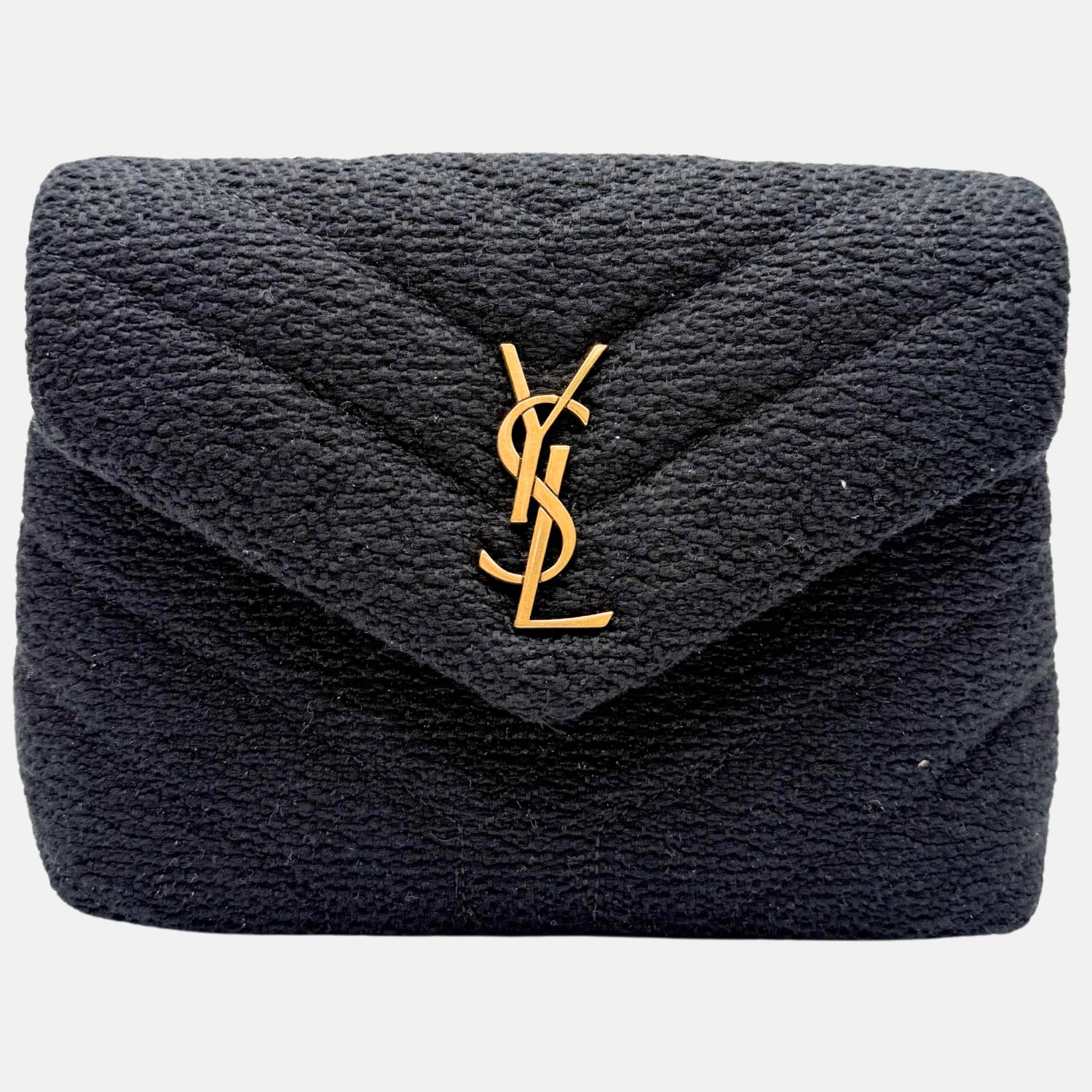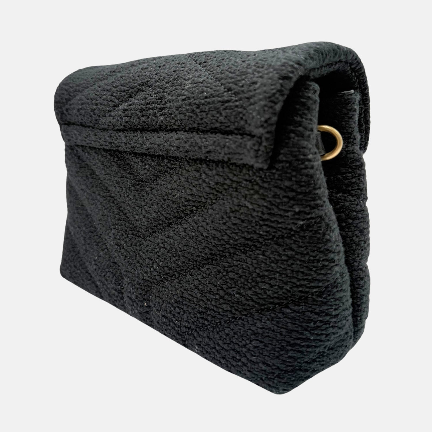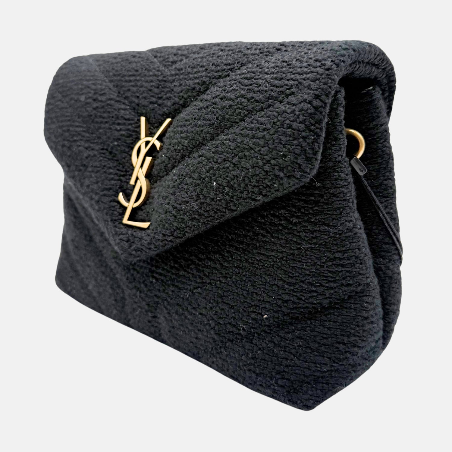 The Saint Laurent Puffer Crossbody Bag Black Bouclé Fabric Medium brings cozy texture to one of the house’s most recognizable shapes. Made from rich black bouclé and finished with signature chevron quilting, this piece features a soft envelope silhouette and bold gold YSL monogram. A discreet chain strap allows for hands-free styling, making it equal parts polished and practical for day or night wear with a modern seasonal twist.
