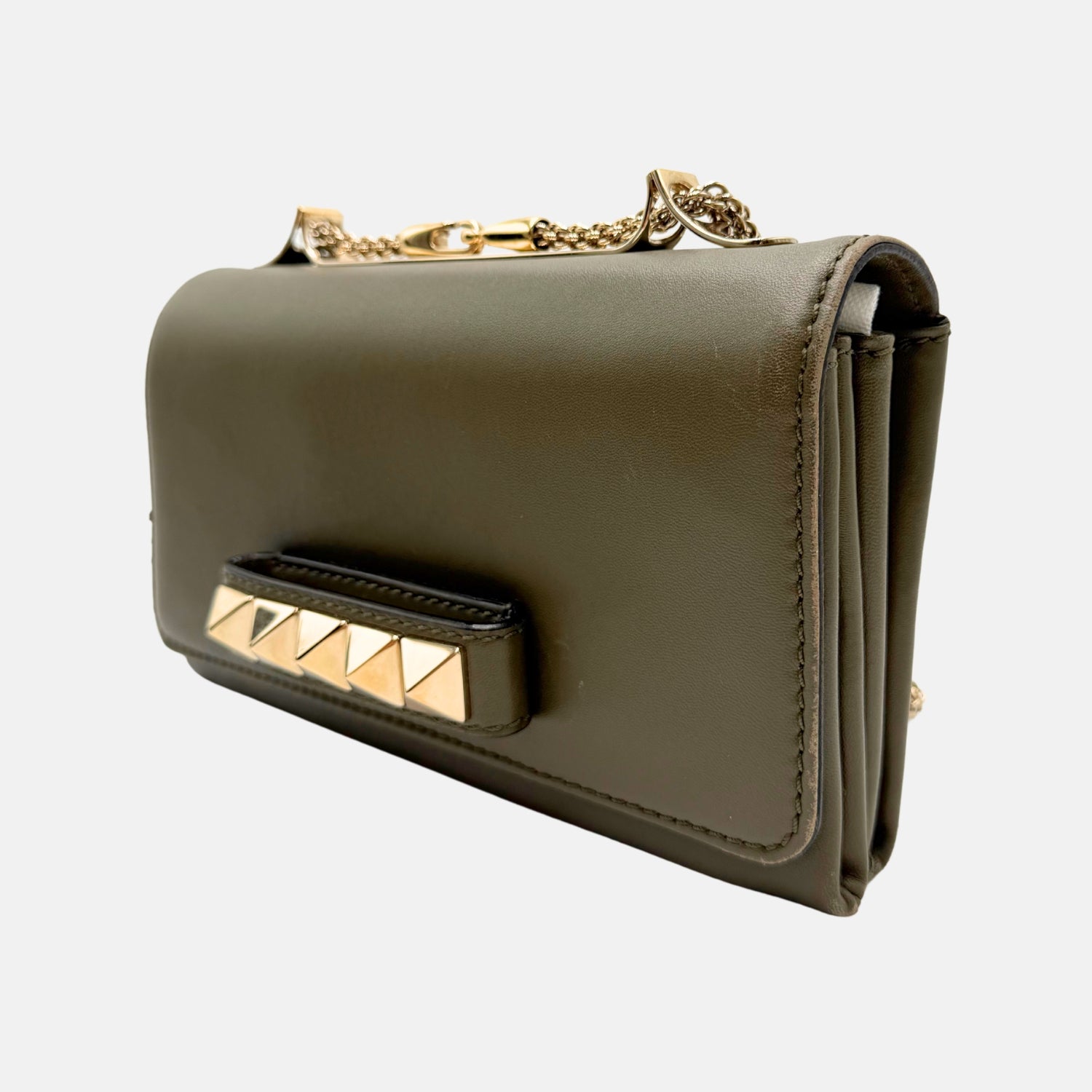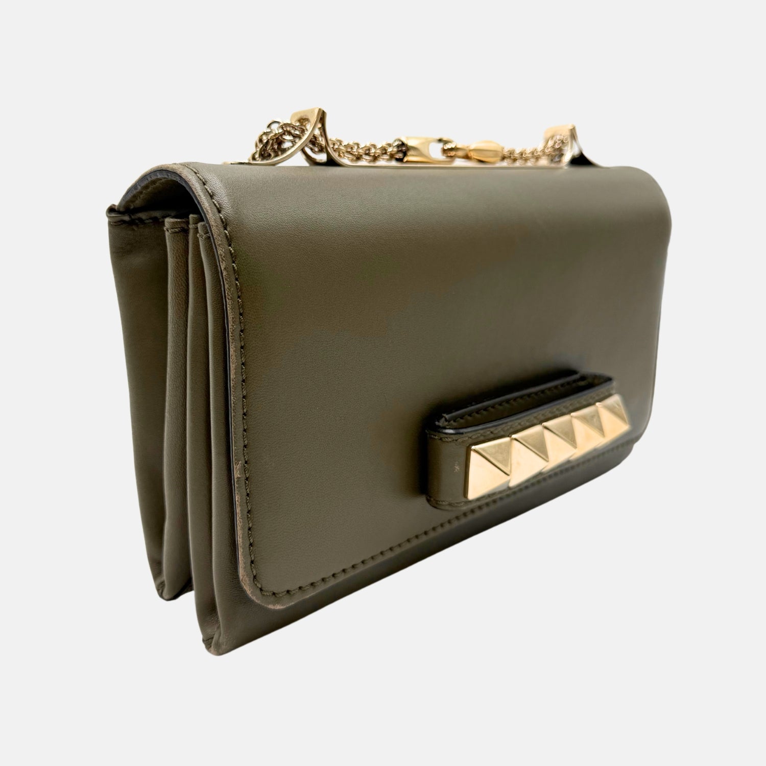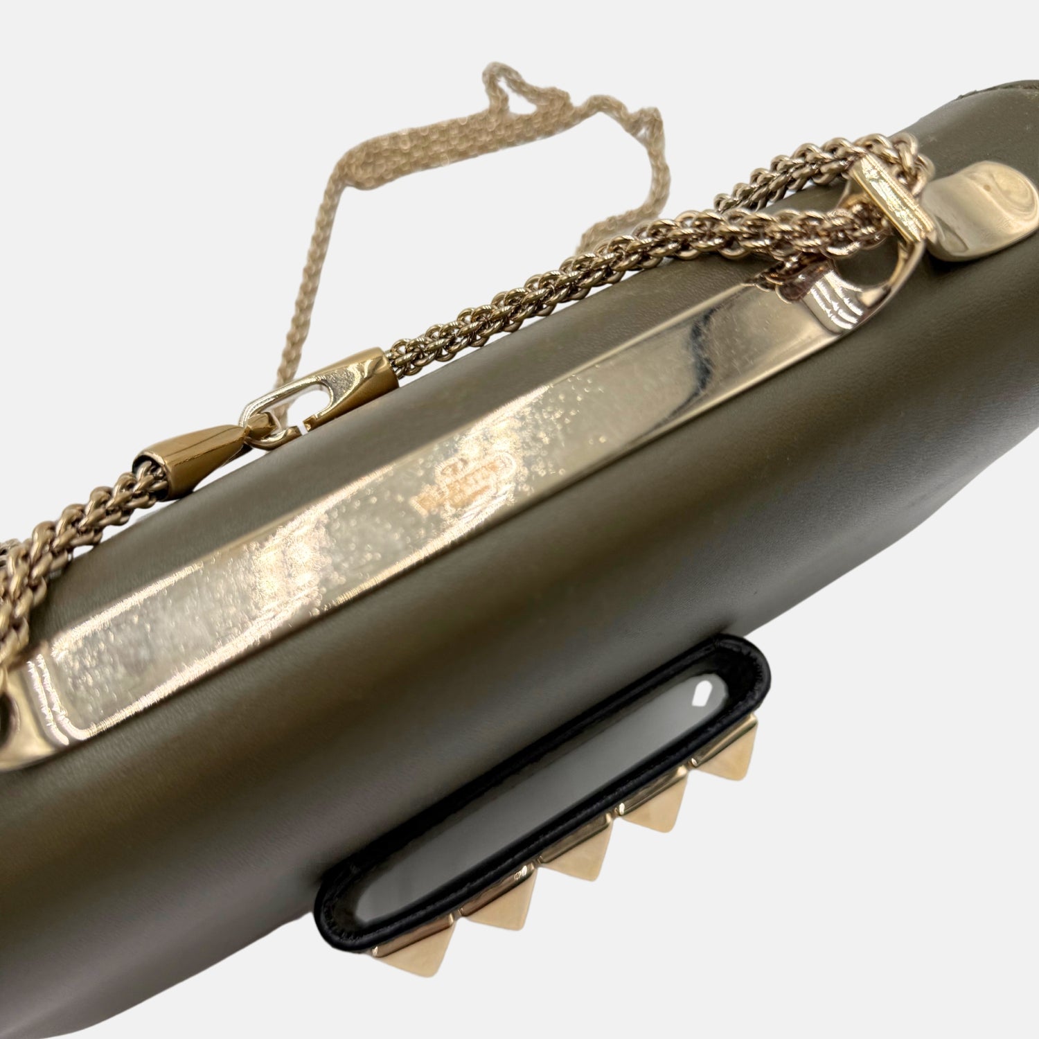 The Valentino Rockstud Clutch Olive Green Leather Small brings a bold, modern edge to evening and occasion dressing. Crafted from smooth olive green leather, this compact piece features the iconic gold pyramid studs across the front hand strap and a delicate chain shoulder strap for versatile styling. With a magnetic flap closure and just enough room for essentials, it is a refined blend of statement and sophistication in true Valentino fashion.