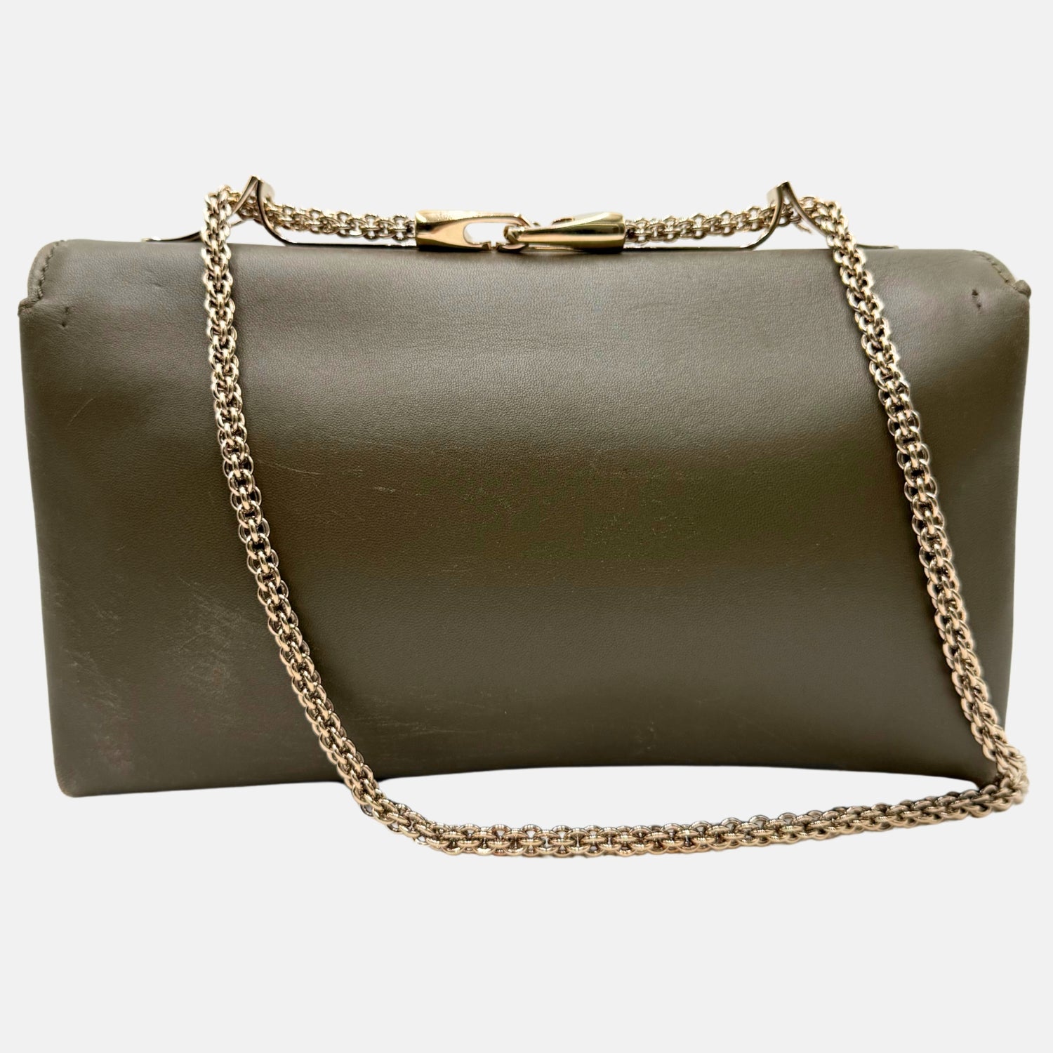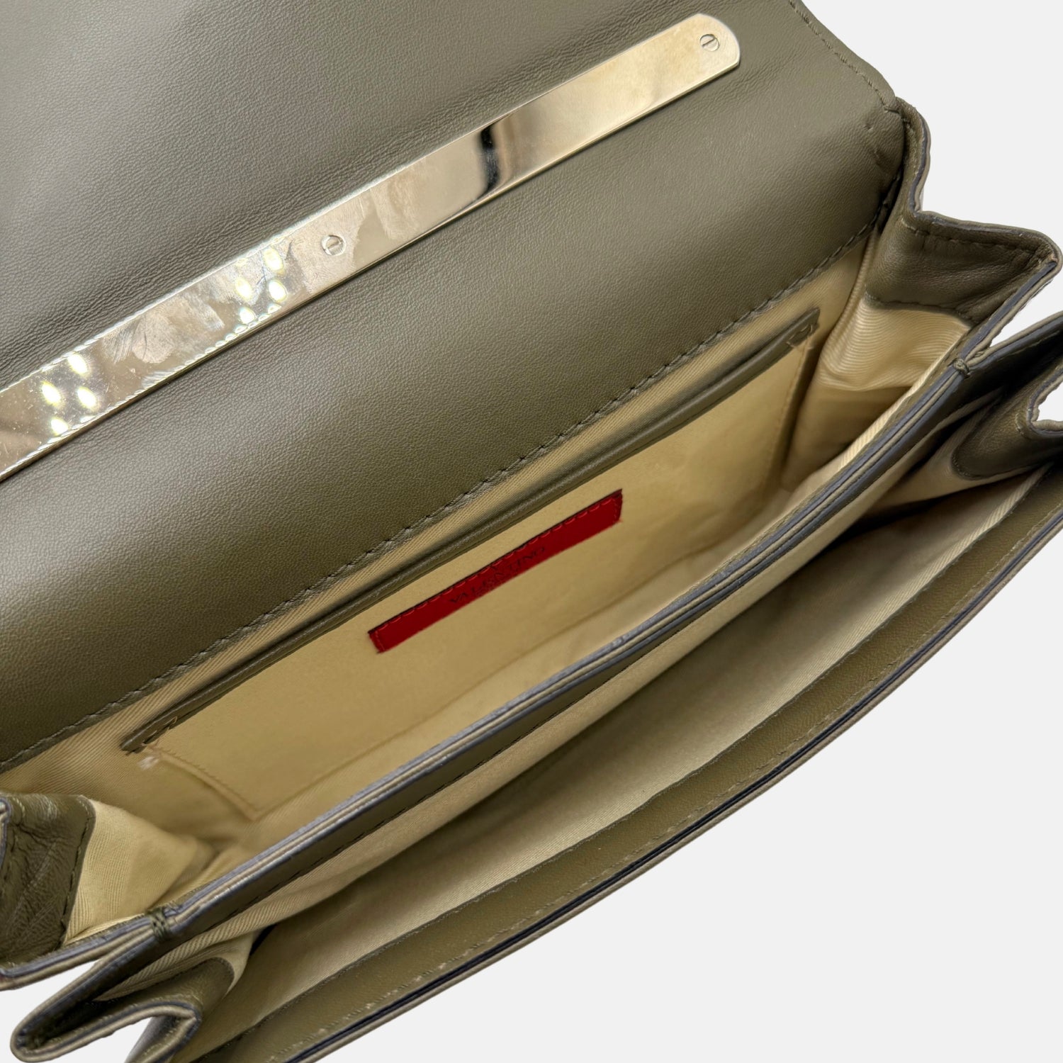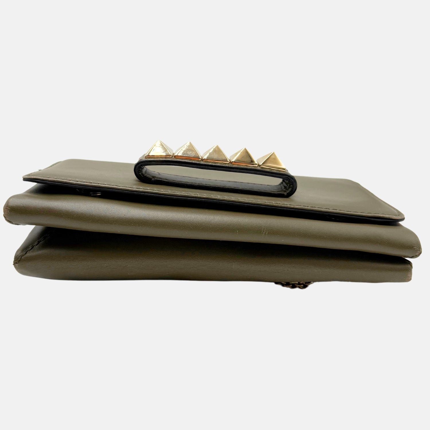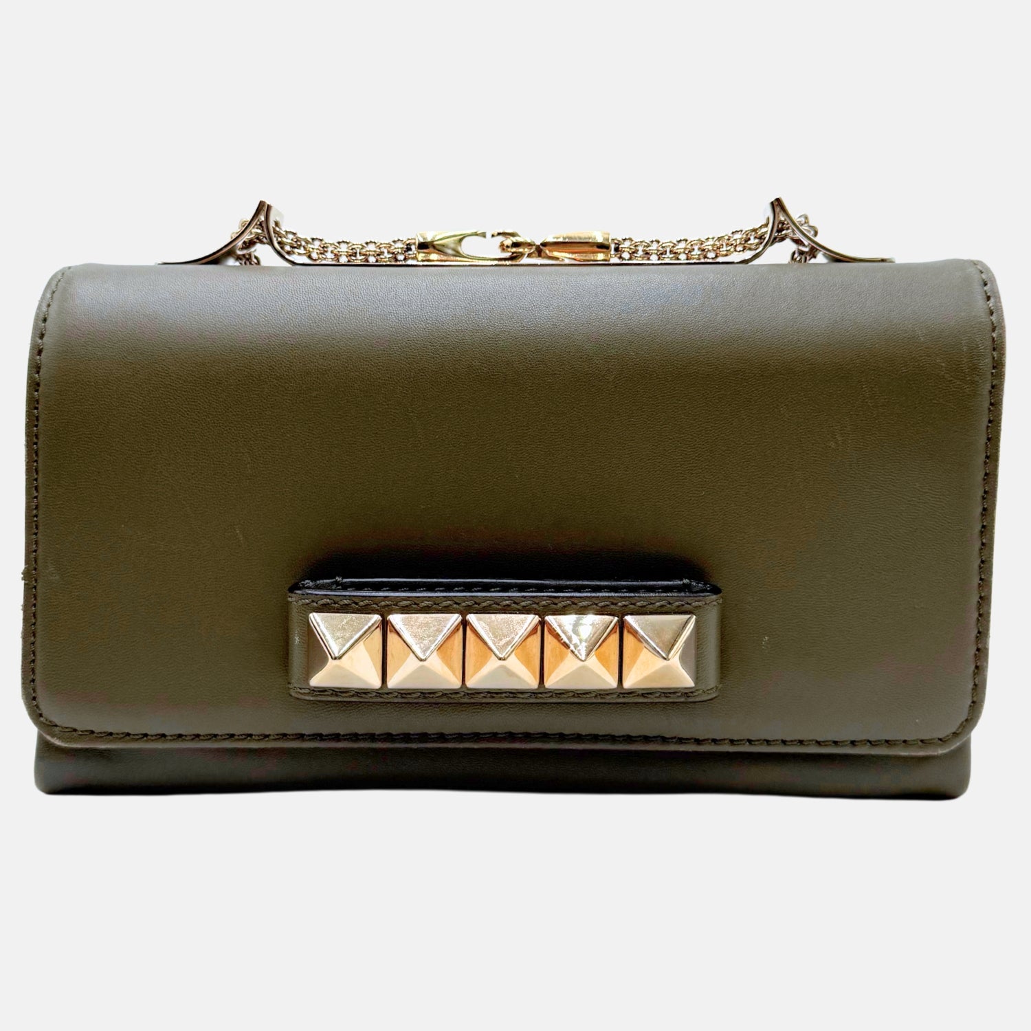The Valentino Rockstud Clutch Olive Green Leather Small brings a bold, modern edge to evening and occasion dressing. Crafted from smooth olive green leather, this compact piece features the iconic gold pyramid studs across the front hand strap and a delicate chain shoulder strap for versatile styling. With a magnetic flap closure and just enough room for essentials, it is a refined blend of statement and sophistication in true Valentino fashion.