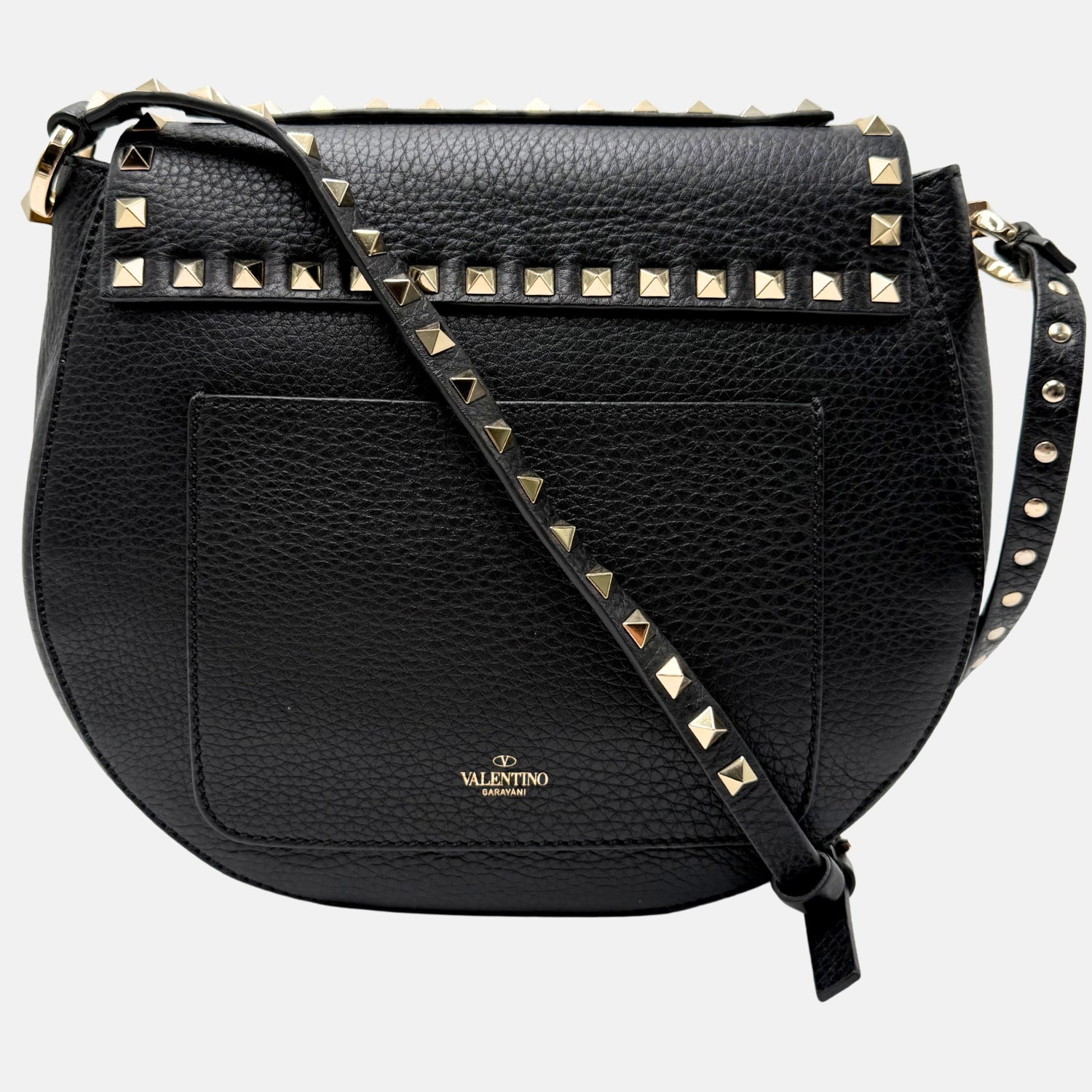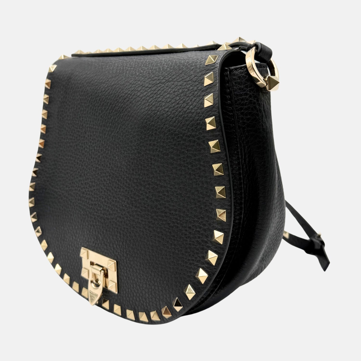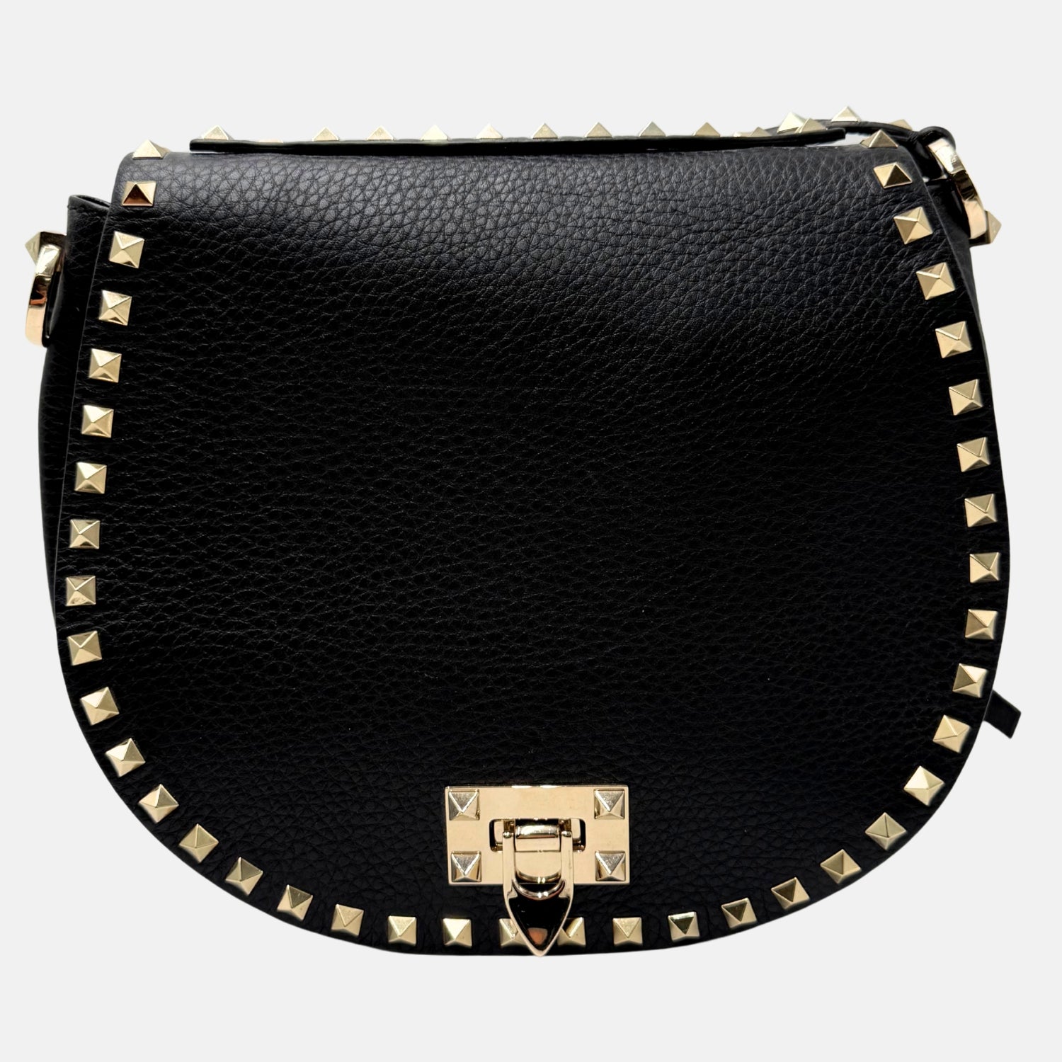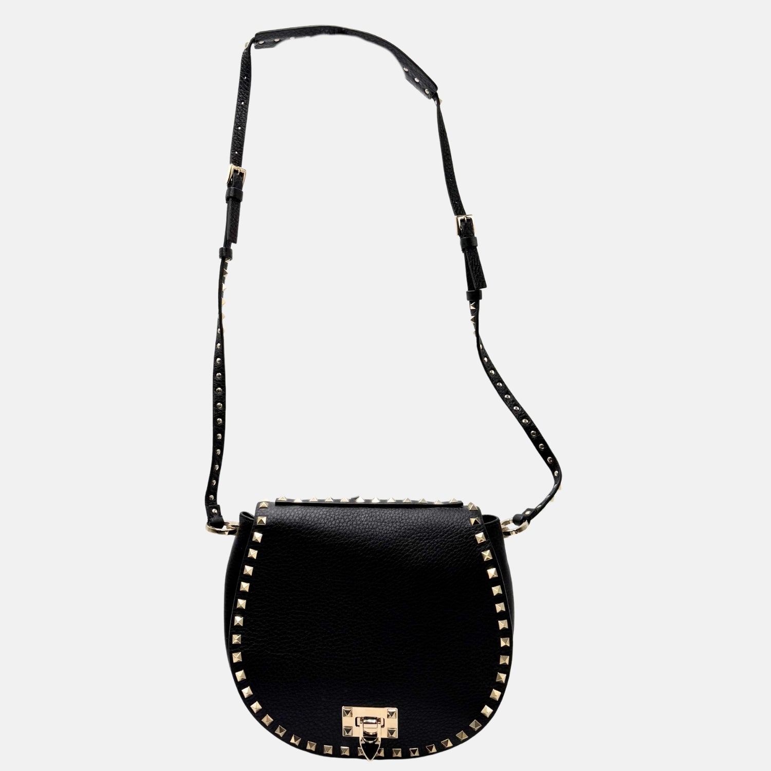 A striking balance of edge and elegance, the Valentino Rockstud Crossbody Bag in black grained leather features the brand’s signature pyramid studs for an instantly recognizable statement. The saddle-shaped silhouette is crafted from durable, textured leather and accented with gleaming gold-tone hardware, including a secure flip-lock closure. This versatile piece easily transitions from day to night, adding bold sophistication to any outfit.