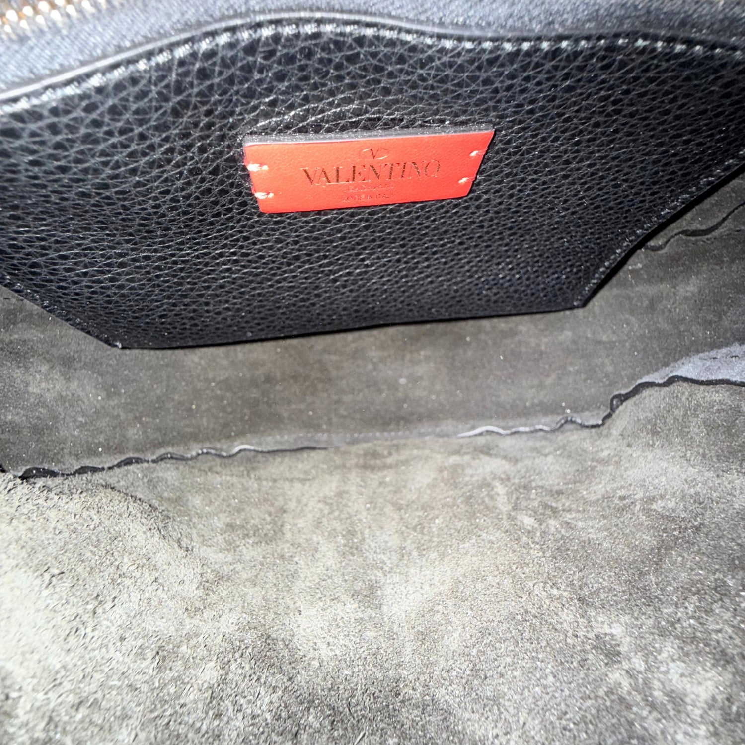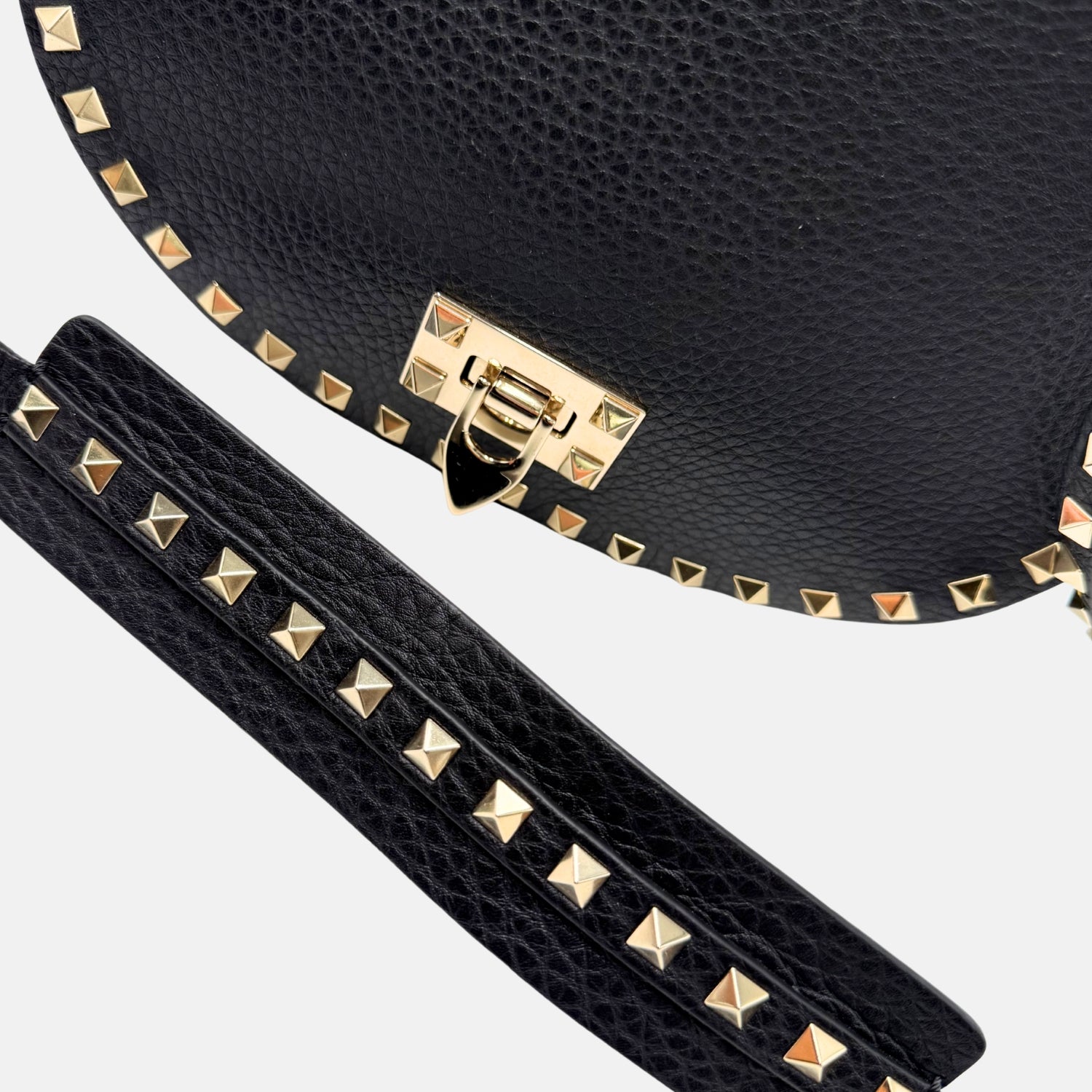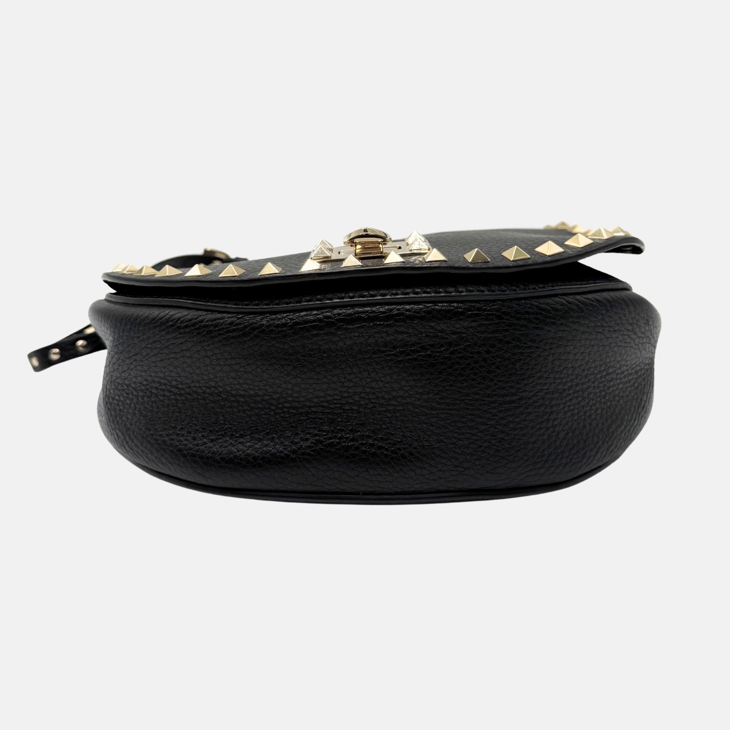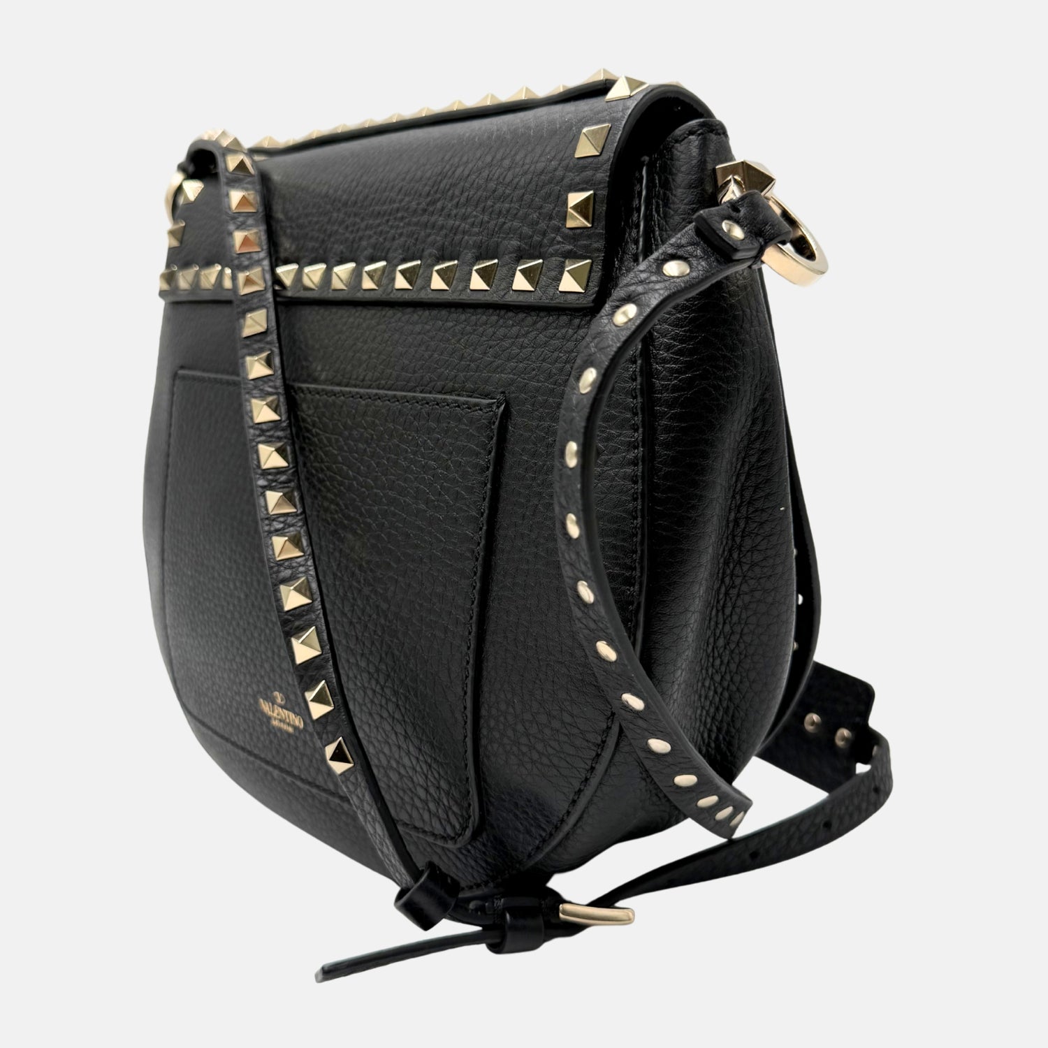 A striking balance of edge and elegance, the Valentino Rockstud Crossbody Bag in black grained leather features the brand’s signature pyramid studs for an instantly recognizable statement. The saddle-shaped silhouette is crafted from durable, textured leather and accented with gleaming gold-tone hardware, including a secure flip-lock closure. This versatile piece easily transitions from day to night, adding bold sophistication to any outfit.