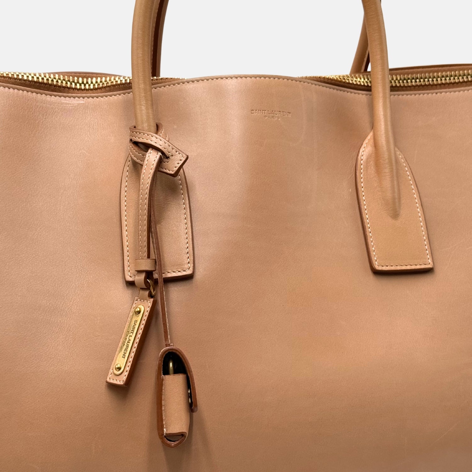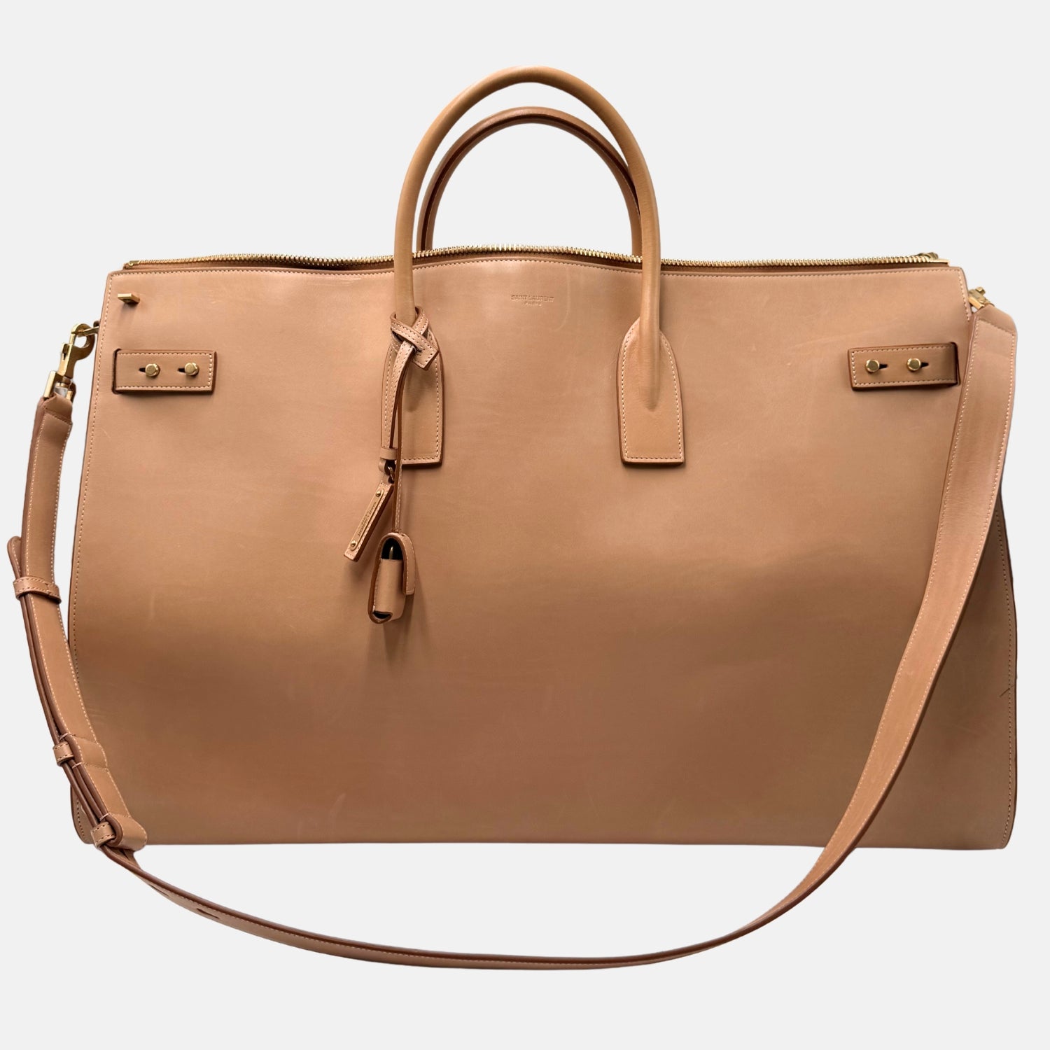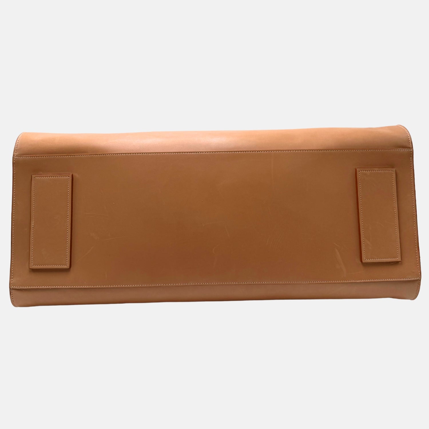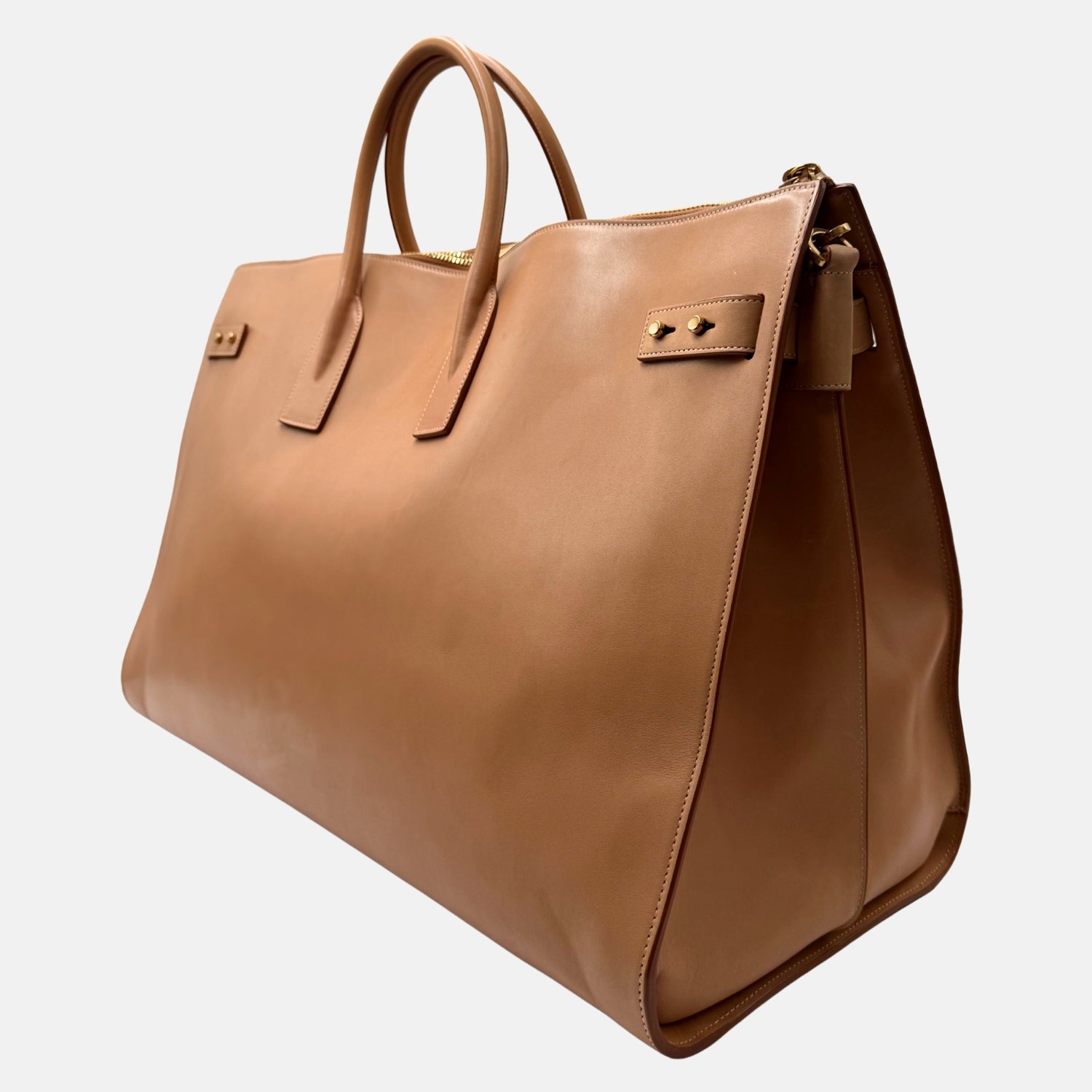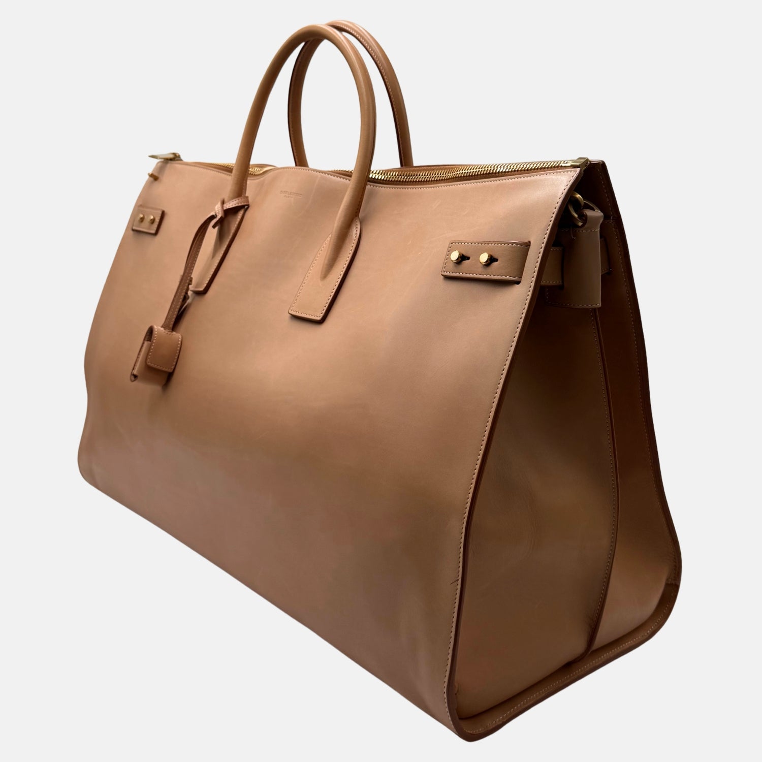 The Saint Laurent Sac De Jour Large Duffel is a refined travel companion with architectural lines and a minimalist silhouette. Crafted from smooth tan calfskin leather, this oversized piece balances function and form, offering ample space for extended trips or chic weekend getaways. Signature elements like accordion sides, tubular top handles, a padlock in a leather case, and subtle embossed branding add quiet luxury to the streamlined design.
