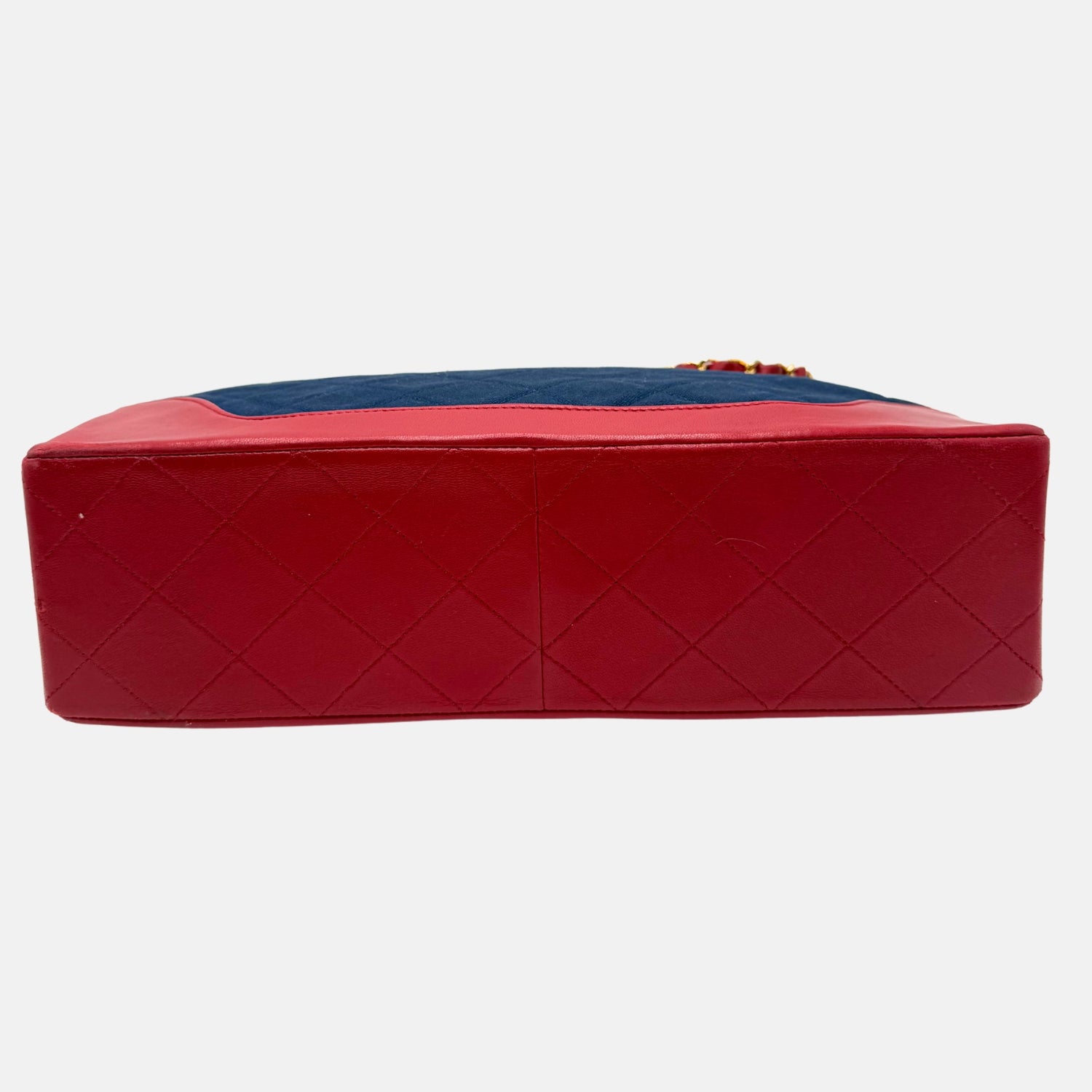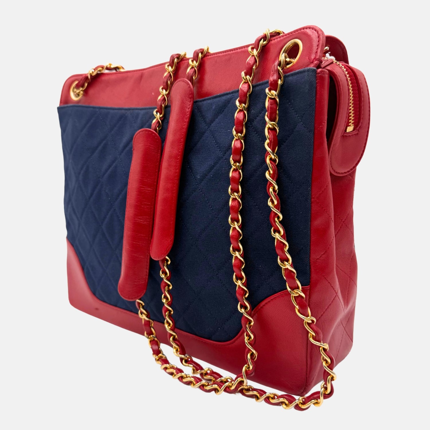 The Chanel Tote Navy Velour and Red Leather Vintage is a bold archival treasure with standout texture and color. Crafted from rich quilted navy velour and trimmed in smooth red leather, this vintage tote features signature gold-tone chain and leather straps for classic shoulder wear. The soft sheen of the fabric paired with vibrant contrast makes it a striking nod to late 80s and early 90s Chanel, offering both collector appeal and functional elegance.